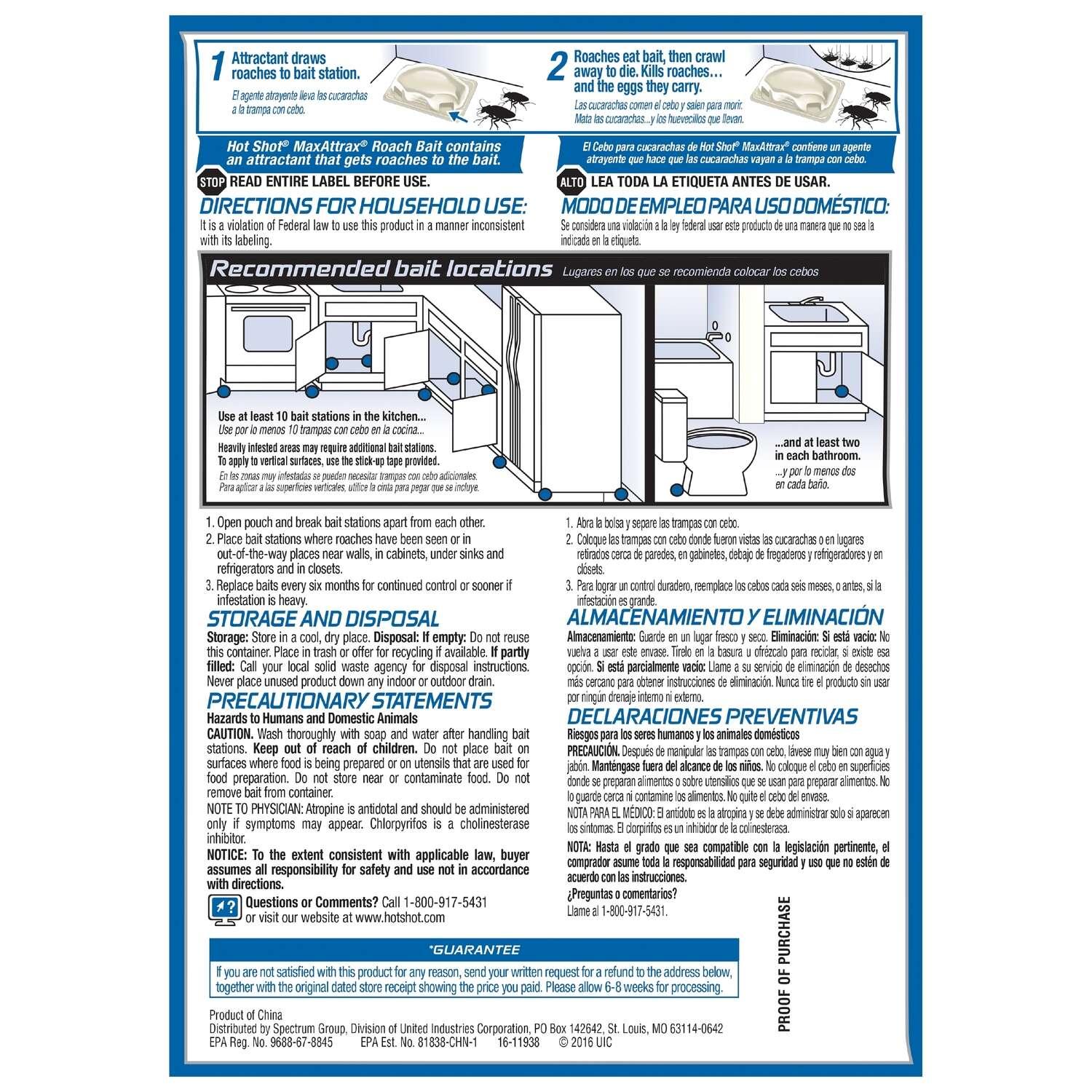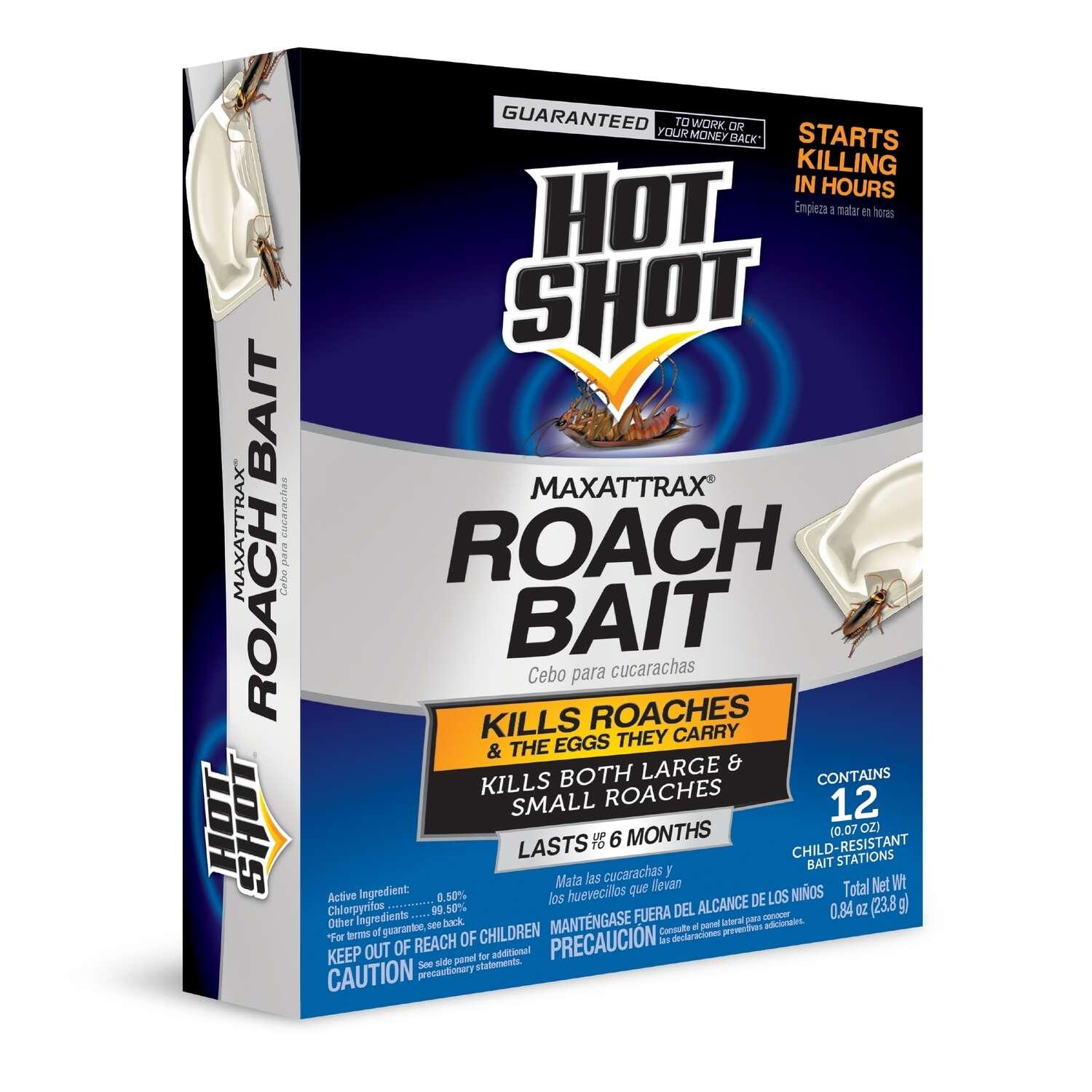 Hot Shot MaxAttrax Roach Bait starts killing in hours! Break bait stations apart from each other, then place in areas where roaches have been seen or in out-of-the-way places near walls, in cabinets, under sinks and refrigerators and in closets. Replace baits every six months for continued control or sooner if infestation is heavy.