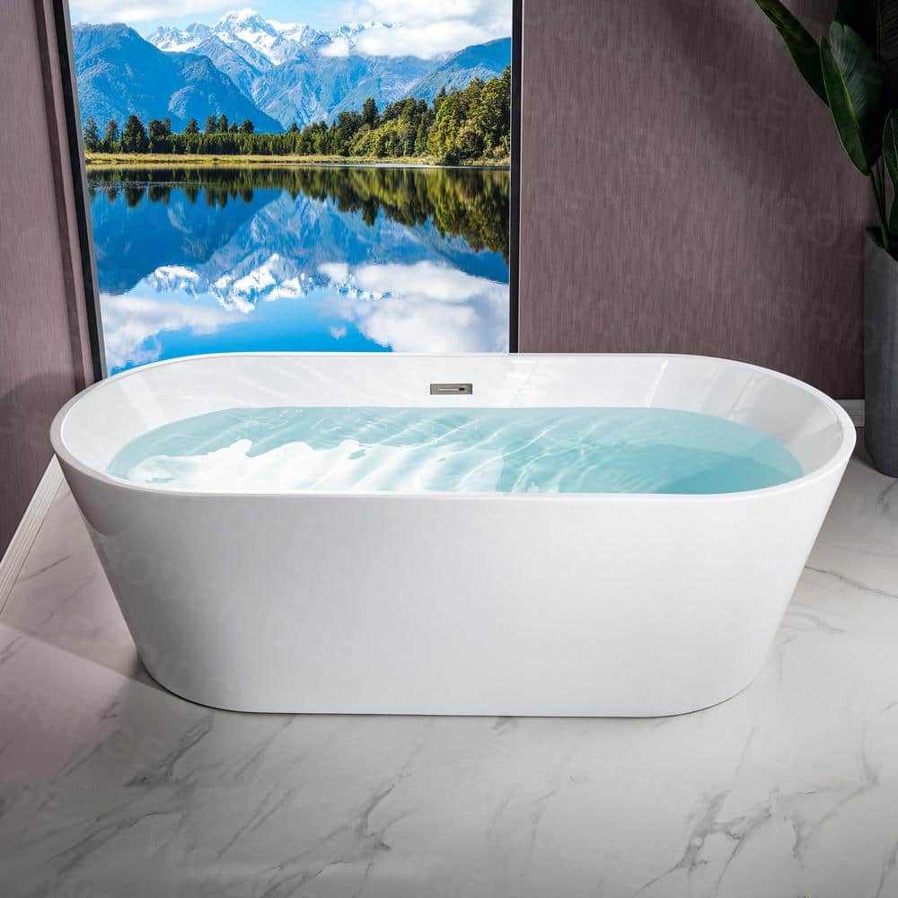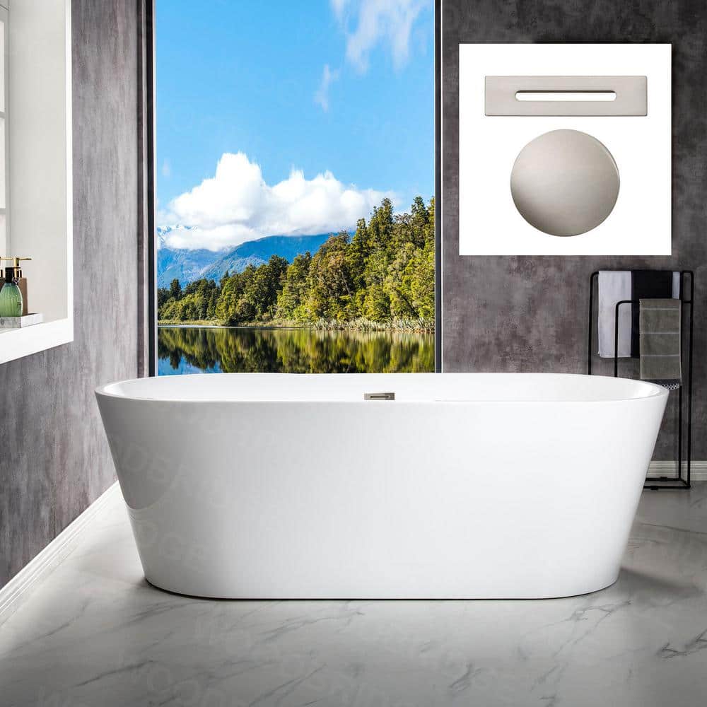 This freestanding silhouette brings an effortless calm to the bath, its oval lines and soft taper creating a gentle, gallery-worthy presence. The brushed nickel overflow is a refined accent against the luminous white acrylic, elevating the look with quiet sophistication. Float it near a window and pair with a minimalist floor-mounted filler to celebrate its sculptural form. It’s a centerpiece that turns everyday bathing into a ritual of luxurious living.