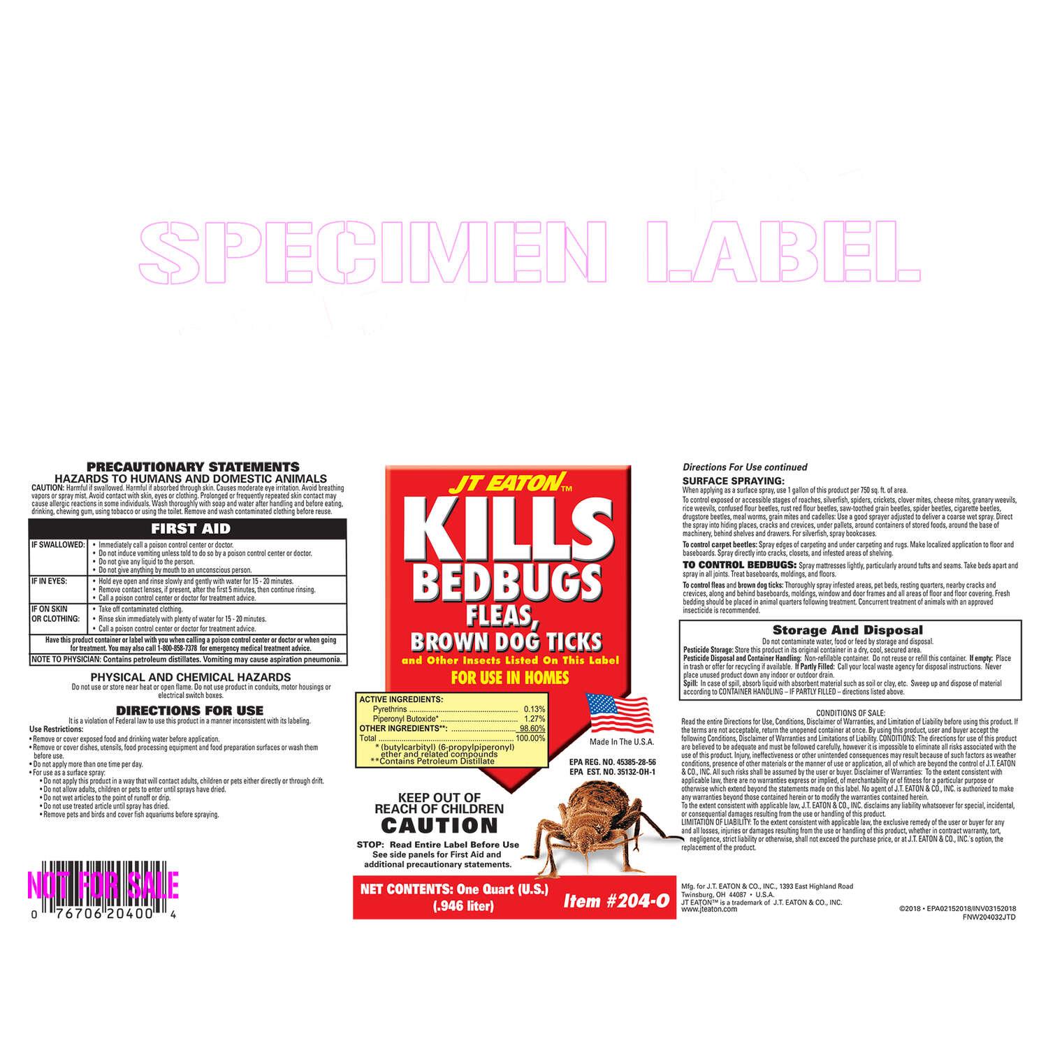 The JT Eaton 204-O oil based bedbug spray is a ready-to-use liquid with sprayer attachments to kill bed bugs, fleas, brown dog ticks and other insects. Simply spray on the infected area and the bedbugs will begin to die off. The active ingredients are pyrethrin (0.13 percent) and piperonyl butoxide (1.27 percent) which effectively kills bedbugs and other insects without leaving residuals. This product comes in a 1 quantity sprayer. The JT Eaton 204-O oil based bedbug spray comes to protect against defects in material and workmanship. JT Eaton mission is to manufacture and distribute products designed to eradicate pests. We continually seek out new ways to provide consumers with the knowledge and products they need to create a healthier and safer world.
