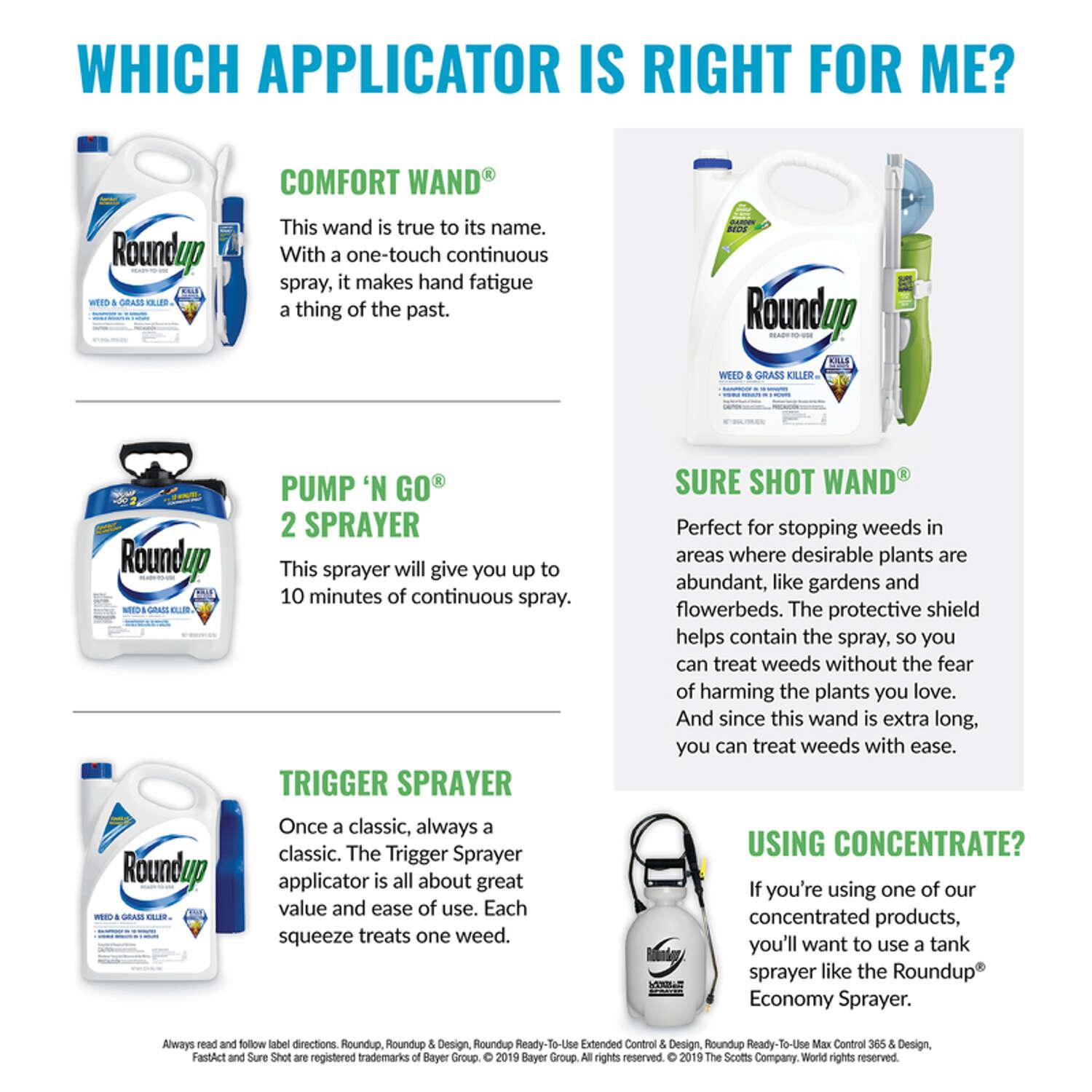 Kill the toughest weeds and grasses down to the root with Roundup Ready-To-Use Weed & Grass Killer III with Pump ‘N Go 2 Sprayer! The formula is ideal for use in and around vegetable gardens, flower beds, tree rings and mulched beds, as well as on cracks in driveways, walkways and patios. Plus the Pump N’ Go Sprayer with an extendable wand provides 10 minutes of continuous spray to ensure that problem weeds and grass will stay away! This convenient, no-mix formula is rainproof in just 10 minutes - and you get visible results in 3 hours. Kill weeds faster with Roundup.