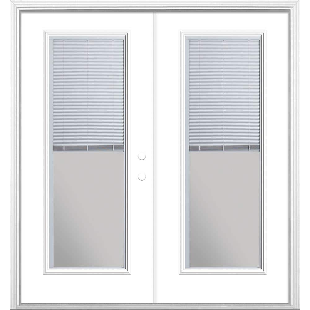 A durable, energy-conscious steel French patio door prehung for left-hand inswing, featuring integrated mini blinds and brickmold. Dual-pane Low-E tempered glass and compression weatherstripping help seal out drafts while offering privacy on demand.