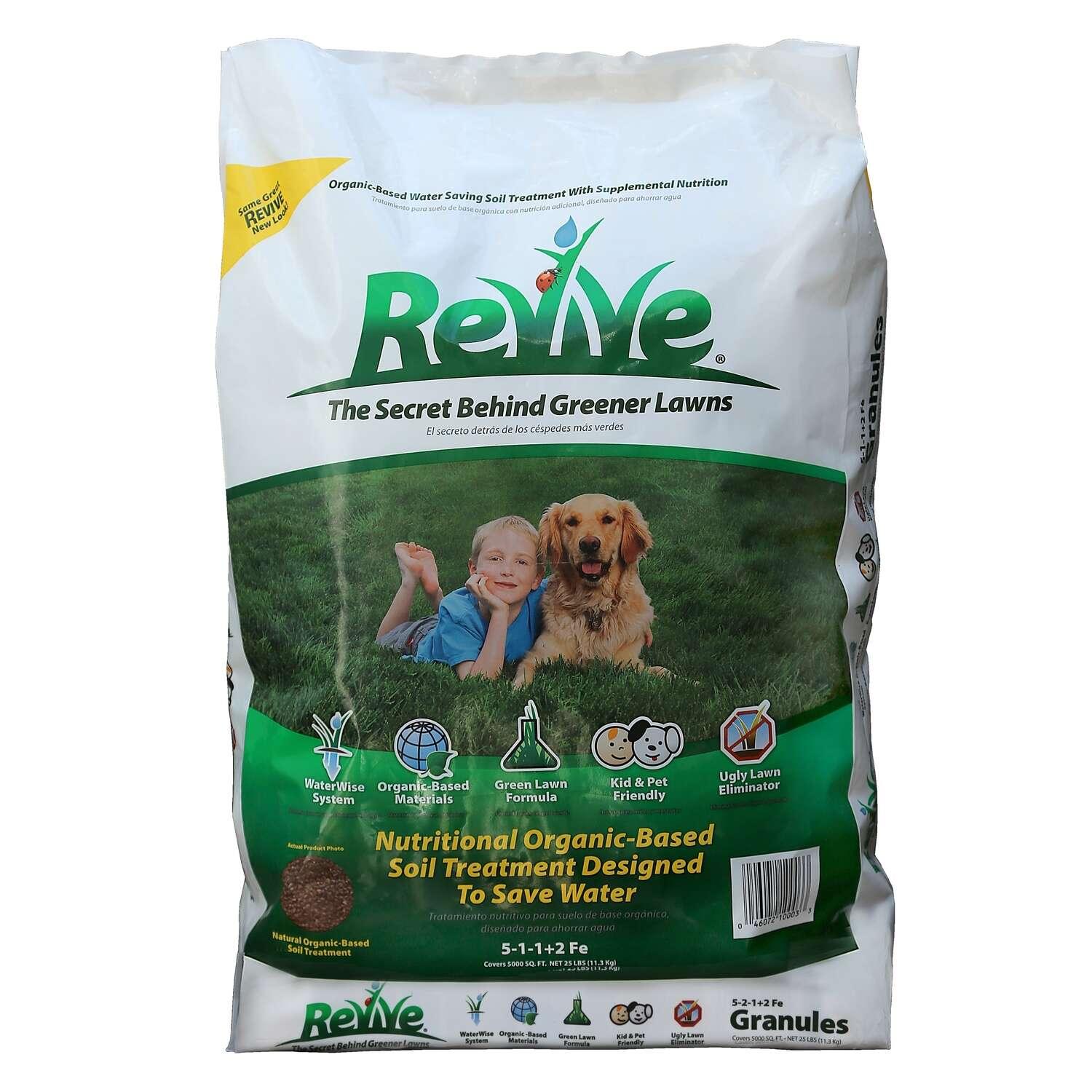 Revive is an organic-based soil treatment made from a combination of soil wetting agents, natural organic lignosulfonates and iron. Revive allows water to penetrate deeper into hard to wet soils, even through thatch and mat. Revive helps save water and solves problems associated with hard, dry, compact soils and the additional iron helps thicken and turn your lawn dark green.