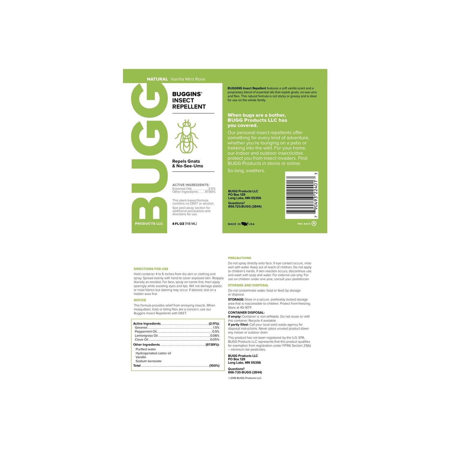 Buggins Insect Repellent - Natural/Original, Vanilla Mint Rose features a soft vanilla scent and a proprietary blend of essential oils that repels gnats, no-see-ums and flies. This water-based formula is not sticky or greasy and is ideal for use on the whole family. This formula provides relief from annoying insects. When mosquitoes, ticks or biting flies are a concern, use our Buggins Insect Repellents with DEET. See product label for ingredients, precautions and directions for use.