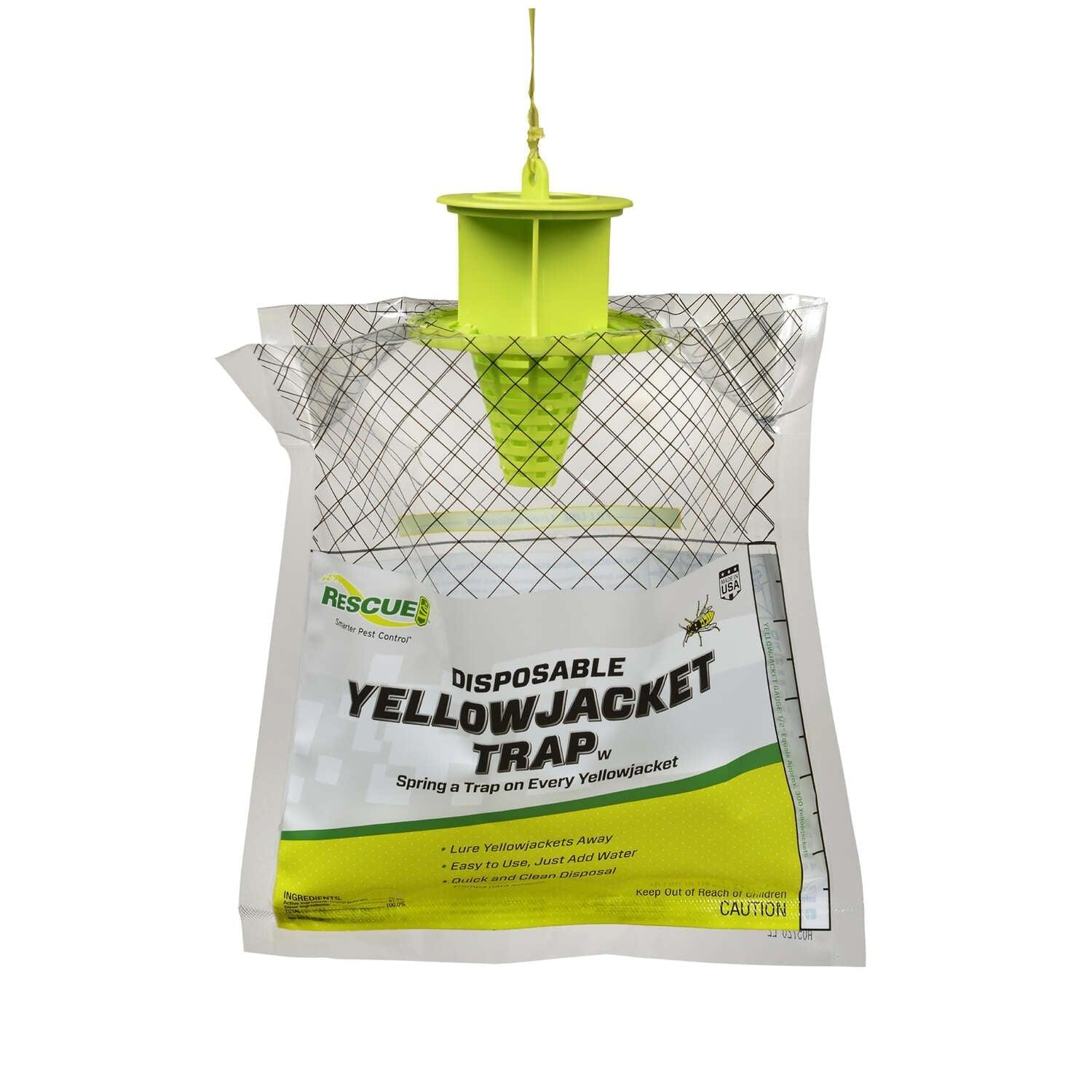 RESCUE! Disposable Yellowjacket Trap is effective in targeting and trapping all of the major species of yellowjacket found in North America. Lured by the powerful scent, yellowjackets enter through the top cap and drown in the water. Ideal for picnics or camping, Disposable Yellowjacket Traps have convenient yellowjacket control in the bag.