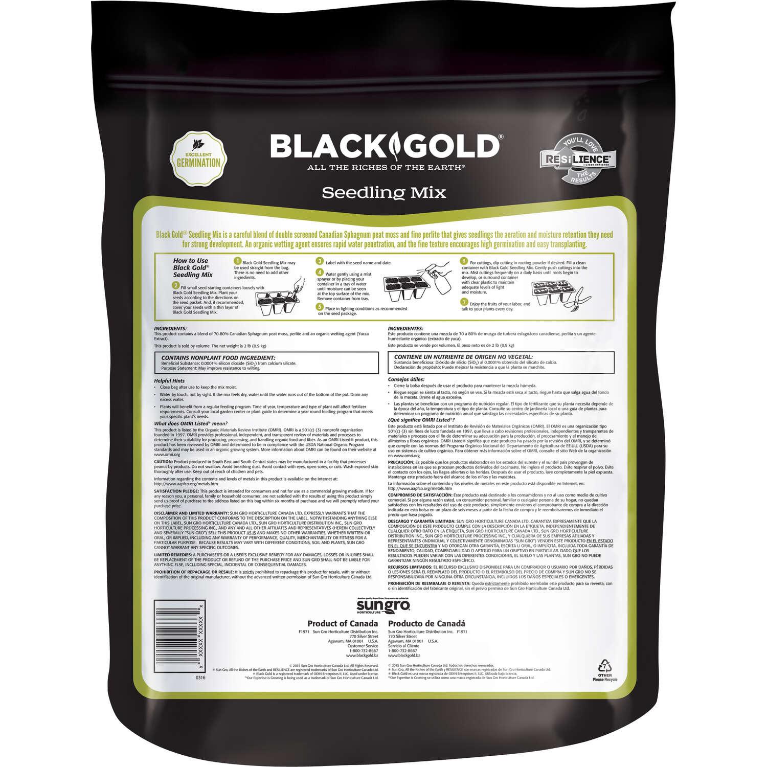 Black Gold Seedling Mix is a highly refined natural & organic mix which is excellent for seed germination and root growth of newly germinated seedlings. It is fine, yet porous and water-retentive and has an organic wetting agent to ensure uniform water penetration.