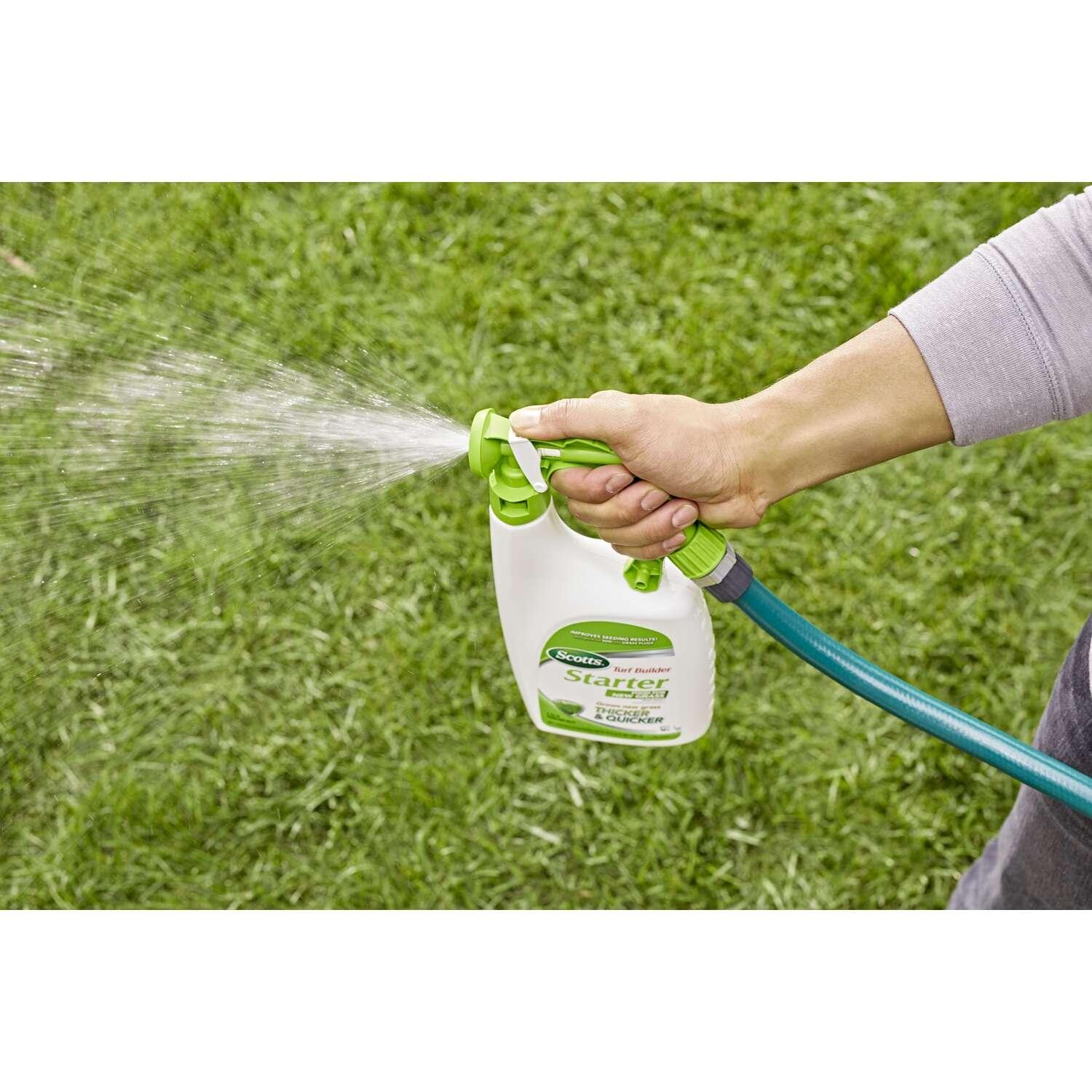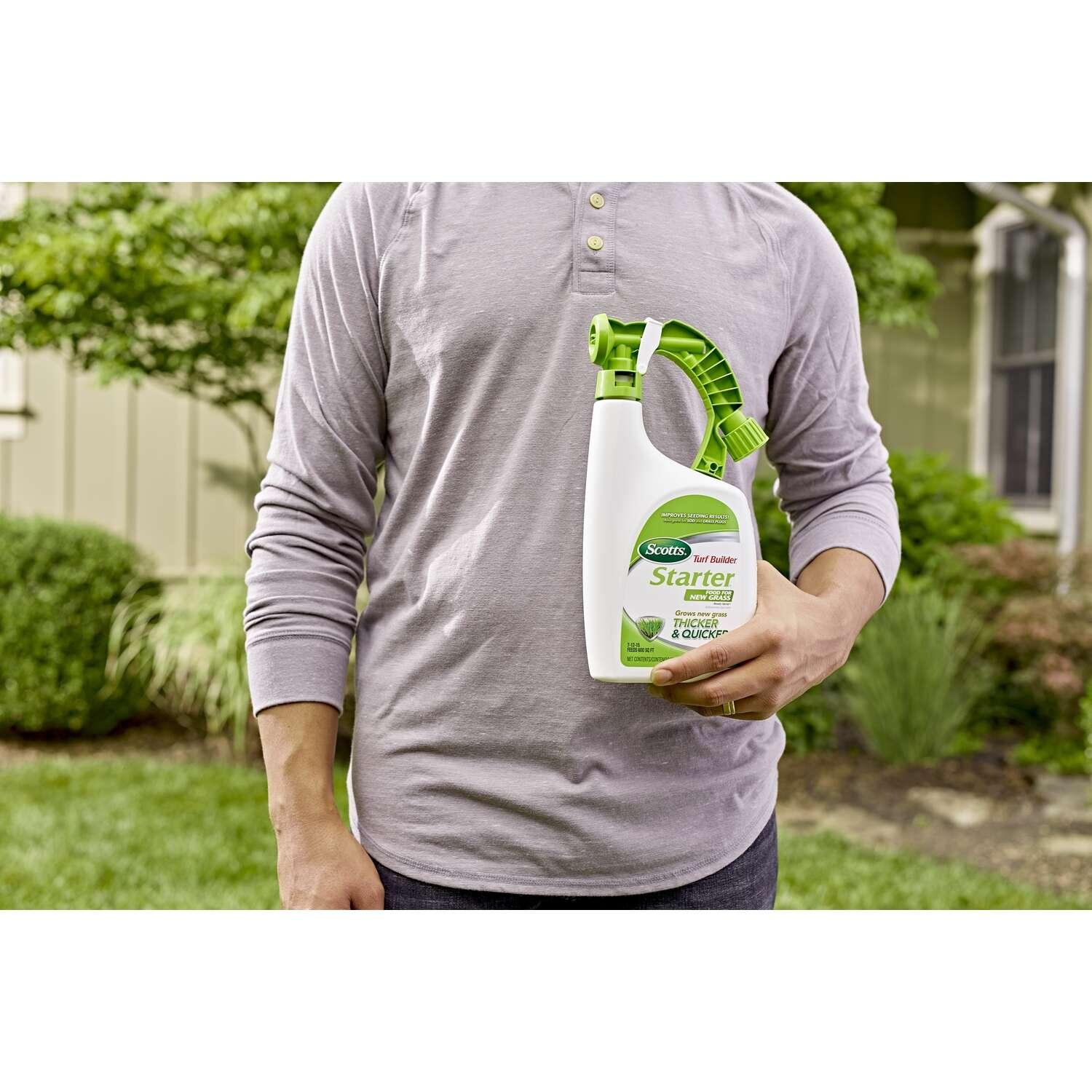Grow new grass thicker and quicker, vs. unfed grass, with Scotts Turf Builder Starter Food for New Grass Ready-Spray. Scotts Turf Builder Starter Food for New Grass Ready-Spray makes it easy to feed and water your grass at the same time to improve seeding results for a beautiful, green lawn. It's also great for sod and grass plugs.