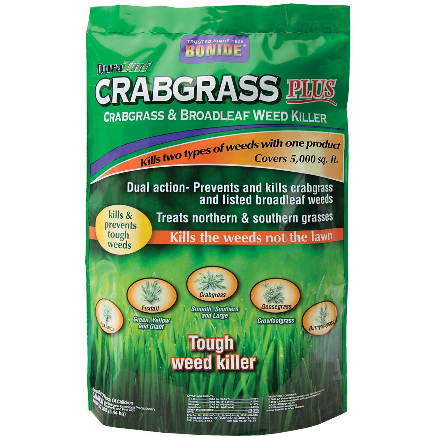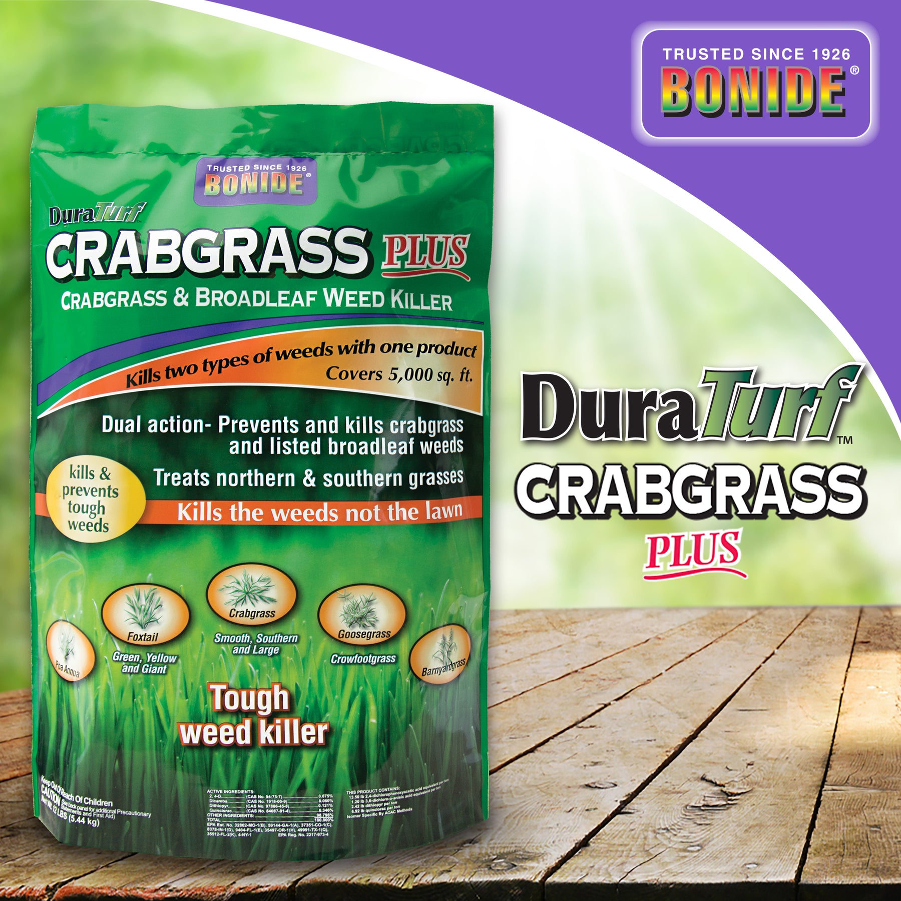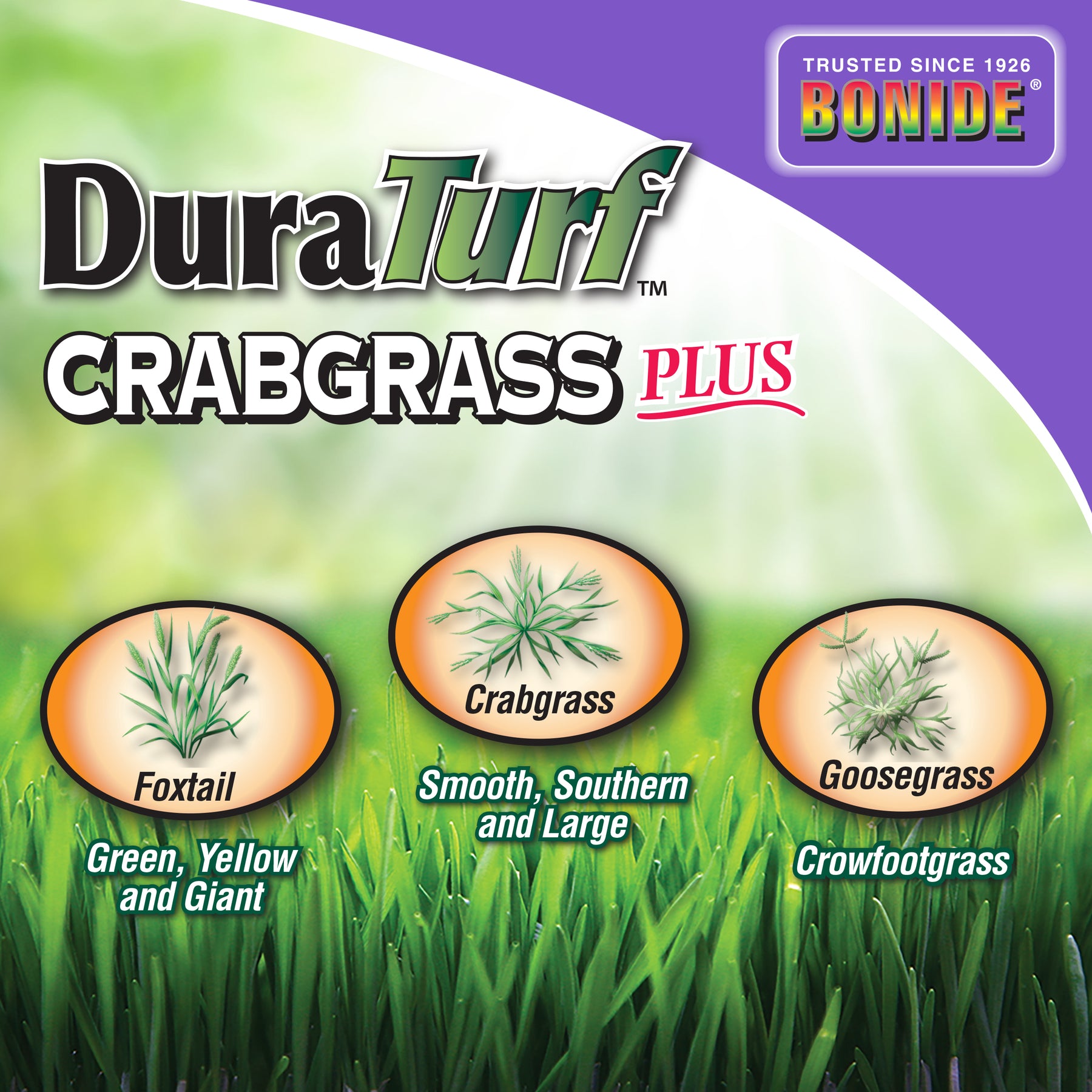 Bonide DuraTurf Crabgrass Plus is a post-emergent lawn treatment that kills and prevents crabgrass and listed broadleaf weeds. The 12 lb granular formula treats both northern and southern grasses while targeting tough weeds without harming lawns.