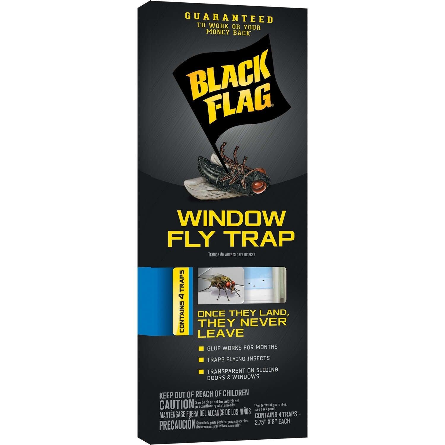 Black Flag Window Fly Traps are a simple way to control flies, mosquitoes, gnats, moths and other flying pests without the use of insecticides. The discreet, transparent design sticks on windows and glass doors. Just peel and stick. Use anywhere flying insects are a problem, including living areas, garages, basements, porches and patios and gardens, near garbage containers and inside kennels, barns and stables. The traps are so effective because they’re placed where flies in your home spend most of their time, which is at the window trying to get out. Once flying pests land, they never leave. For best results, clean windows, screens or sliding doors before adhering Black Flag Window Fly Traps so those surfaces are free from dust and grease. Glue works for months or replaces trap when full.