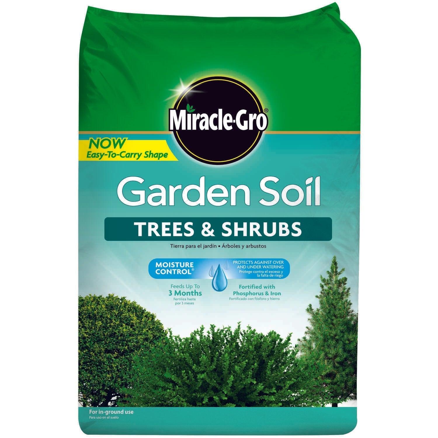Get plants off to a great start with Miracle-Gro Garden Soil Trees & Shrubs. Enriched with continuous release plant food, it will feed trees and shrubs for up to 3 months. It's even fortified with phosphorus and iron to build strong roots and prevent leaf yellowing. Plus, Moisture Control technology protects against over- and under-watering so you can have bigger, more beautiful deciduous, evergreen and flowering trees and shrubs.
