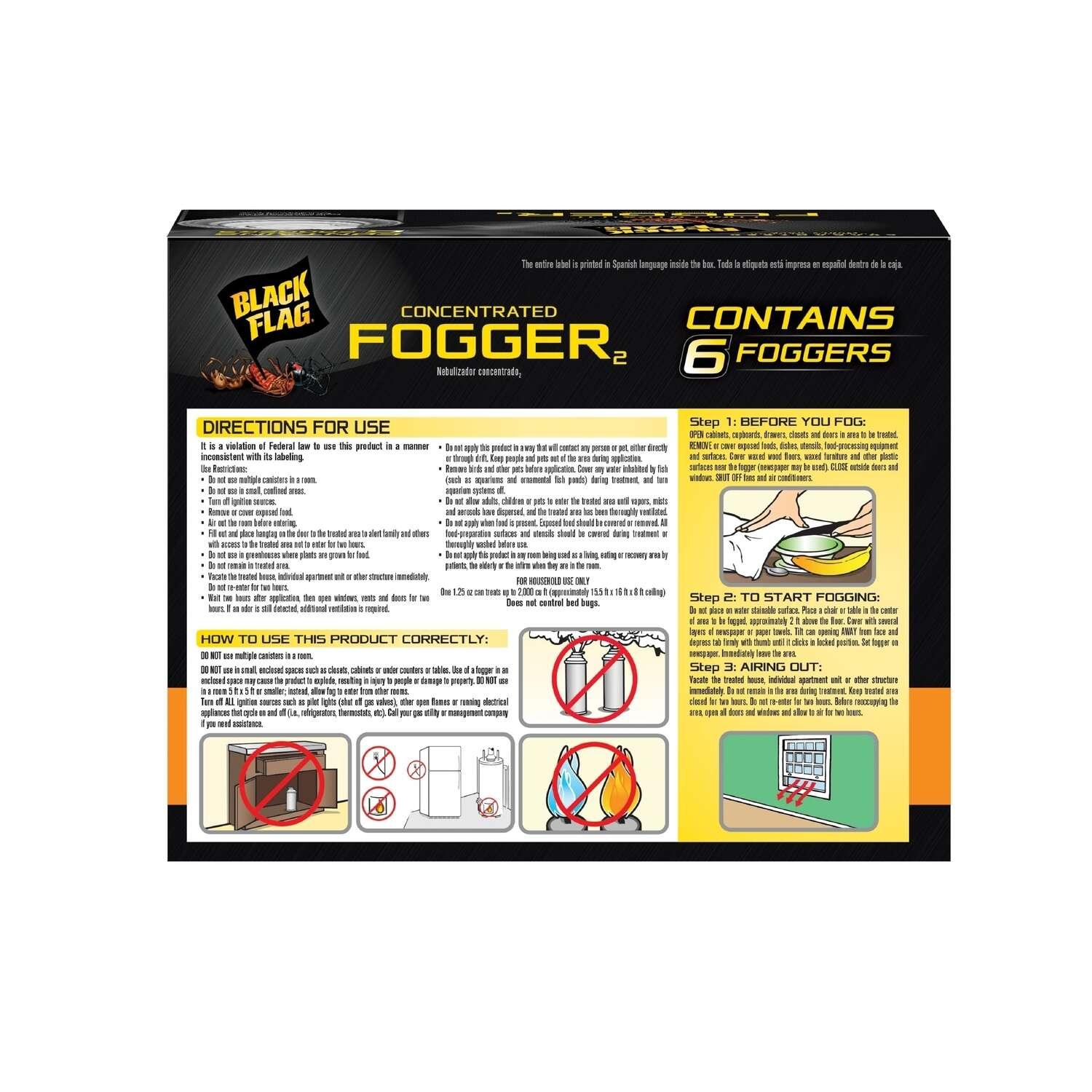 Stop bugs before they raid your kitchen and home with Black Flag Concentrated Fogger. This package contains 6 aerosol cans that release a concentrated fog. Each 1.25 oz can treats a room up to 2,000 cubic feet (or approximately 15.5 feet by 16 feet with an 8-foot ceiling). Black Flag Concentrated Fogger controls a variety of household pests, including roaches, ants (except fire, carpenter, harvester and pharaoh ants), fleas, spiders (except brown recluse), mosquitoes, silverfish, brown dog ticks, houseflies and more as listed. Keeps killing German cockroaches up to 12 weeks on non-porous surfaces. This product will not control bed bugs. Black Flag Concentrated Fogger won’t leave a wet, messy residue. It’s perfect for use in apartments, homes, attics, basements, garages, and household storage areas. Includes convenient hang tags to alert others when they can safely re-enter treated area. Available in pack of 4 includes four individual packages of 6 foggers each (total of 24 foggers).