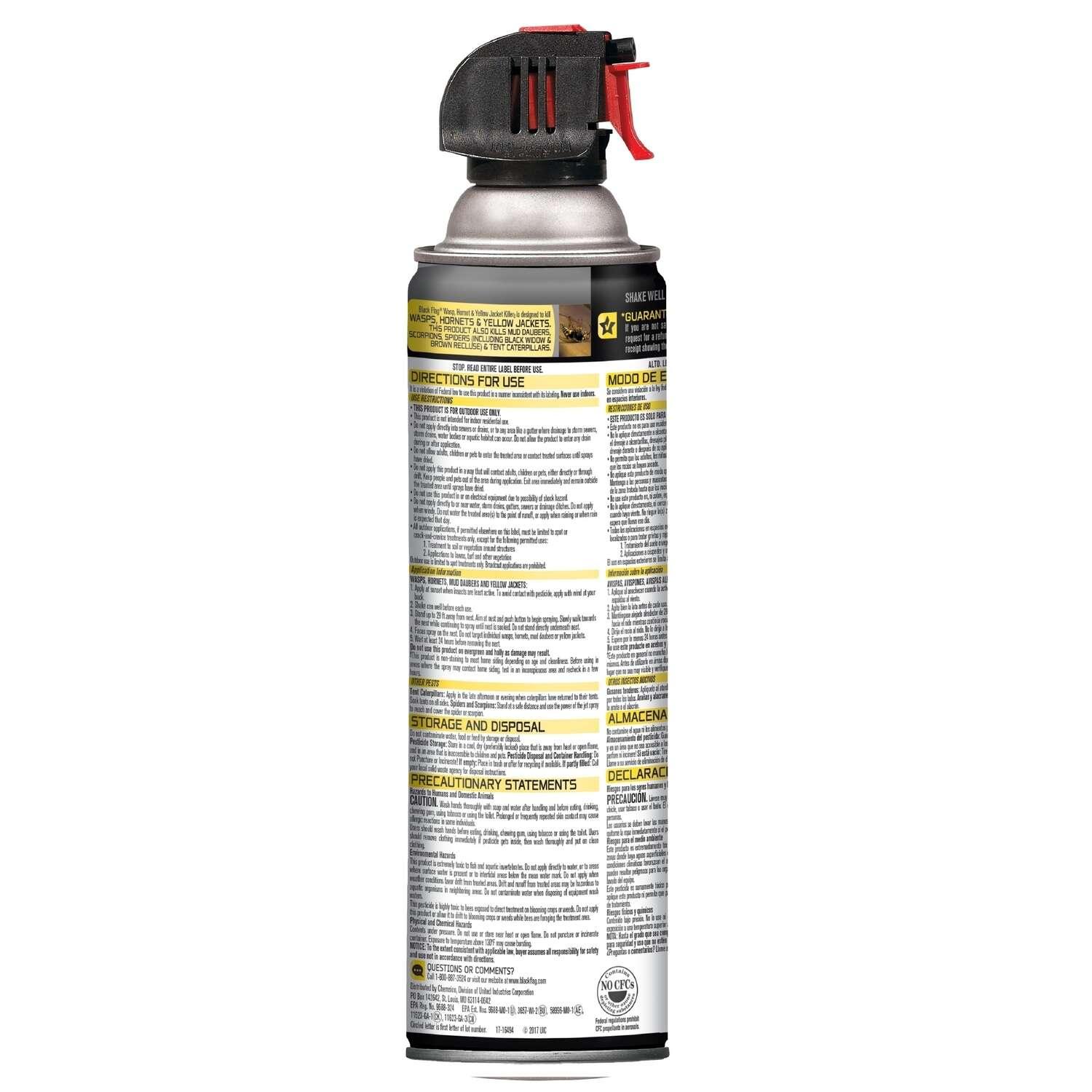 Black Flag Wasp, Hornet & Yellow Jacket Killer aerosol spray kills wasps, hornets and yellow jackets by contact. Also use it to control mud daubers, scorpions, spiders (including black widow and brown recluse) and tent caterpillars. The jet spray shoots a jet spray up 29 feet so you can treat nests above ground from a distance. The non-staining formula can be used around most home siding depending on age and cleanliness (see product label for details). To control wasps, hornets, yellow jackets and mud daubers, spray at sunset when these insects are least active. Stand a safe distance from the nest – don’t stand directly underneath. If it’s windy, stand with the wind at your back to avoid spray drift. Spray the nest until soaked. Wait at least 24 hours before removing the nest. Do not use this product in or on electrical equipment due to the possibility of shock hazard.