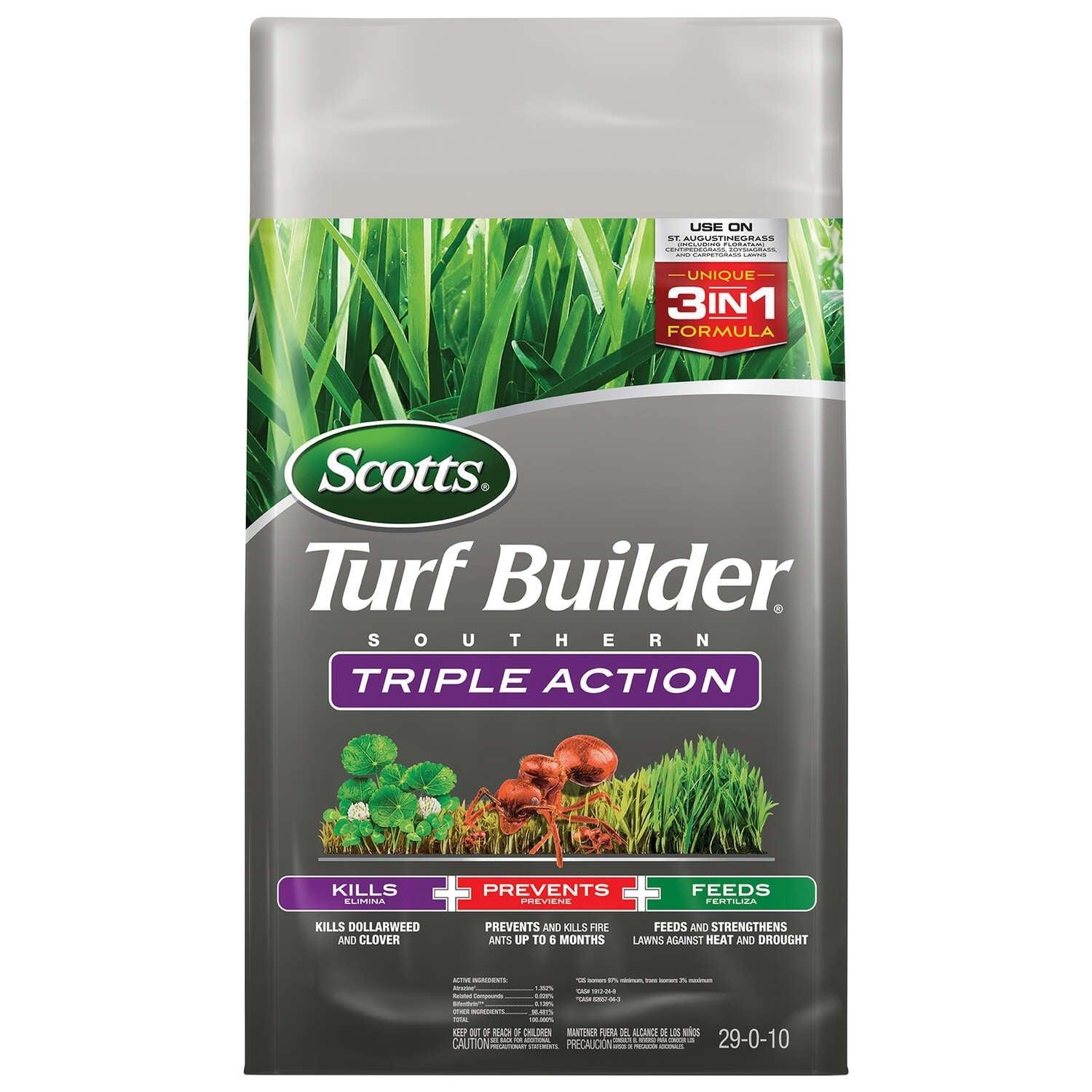 Scotts Turf Builder Southern Triple Action provides three benefits in one bag. This 3-in-1 formula kills weeds, prevents fire ants and feeds your lawn. It prevents and kills fire ants for up to 6 months and also controls armyworms, fleas, mole crickets, chinch bugs, sod webworms and ticks. Kills listed weeds, including dollarweed, clover, oxalis, plantain, chickweed and henbit. Plus, it feeds to strengthen your lawn against Southern stresses like heat and drought. Scotts Turf Builder Southern Triple Action is made specifically for these Southern lawn types: St. Augustine (including Floratam), Carpetgrass, Centipedegrass and Zoysiagrass. This product is cannot be applied to Bermudagrass. Apply with a Scotts spreader when weeds are actively growing. This product must be watered in immediately after application. Do not allow people and pets to re-enter the treated area until watering the lawn is completed and the lawn is dried. A 26.64 lbs. bag treats 8,000 sq. ft.