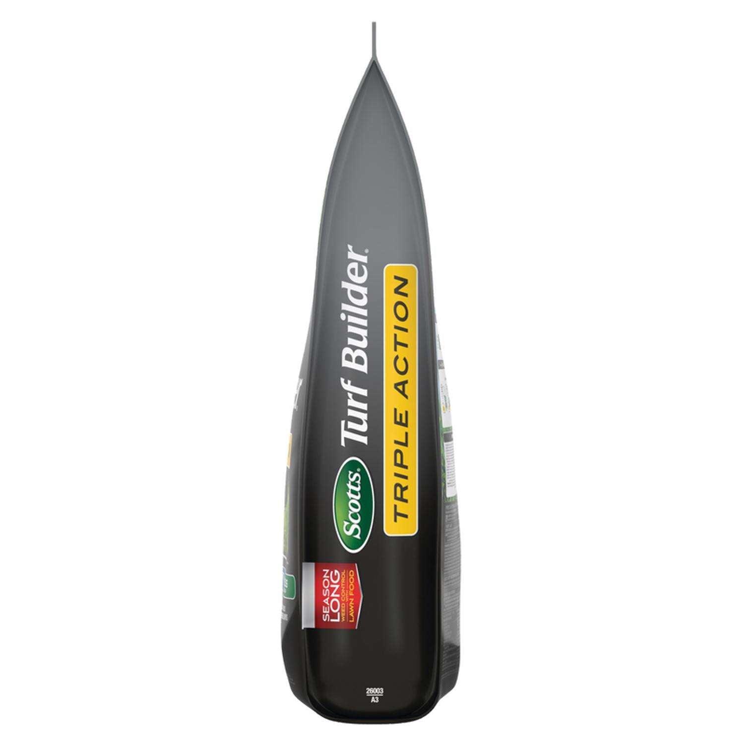 Scotts Turf Builder Triple Action provides three benefits in one bag. This 3-in-1 formula kills and prevents weeds, all while feeding and strengthening your lawn. It kills broadleaf weeds, including dandelions and clover and prevents crabgrass for up to 4 months. It also prevents other listed grassy weeds, including barnyardgrass, fall panicum, foxtail and annual bluegrass. Scotts Turf Builder Triple Action can be applied to Kentucky Bluegrass, Perennial Ryegrass, Tall Fescue, Fine Fescue, Bermudagrass, Bahiagrass, Centipedegrass and Zoysiagrass. Apply with a Scotts spreader when dandelions are actively growing. Make sure the grass is wet from dew or watering before applying to help the particles adhere to weed leaves. After 24 hours, water the lawn to wash particles into the soil to prevent germination of crabgrass and other listed grassy weeds. Do not allow people and pets to re-enter the treated area until dusts have settled. A 20 lb. bag treats 4,000 sq. ft.