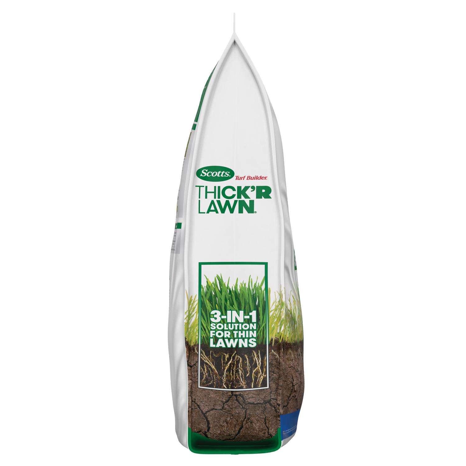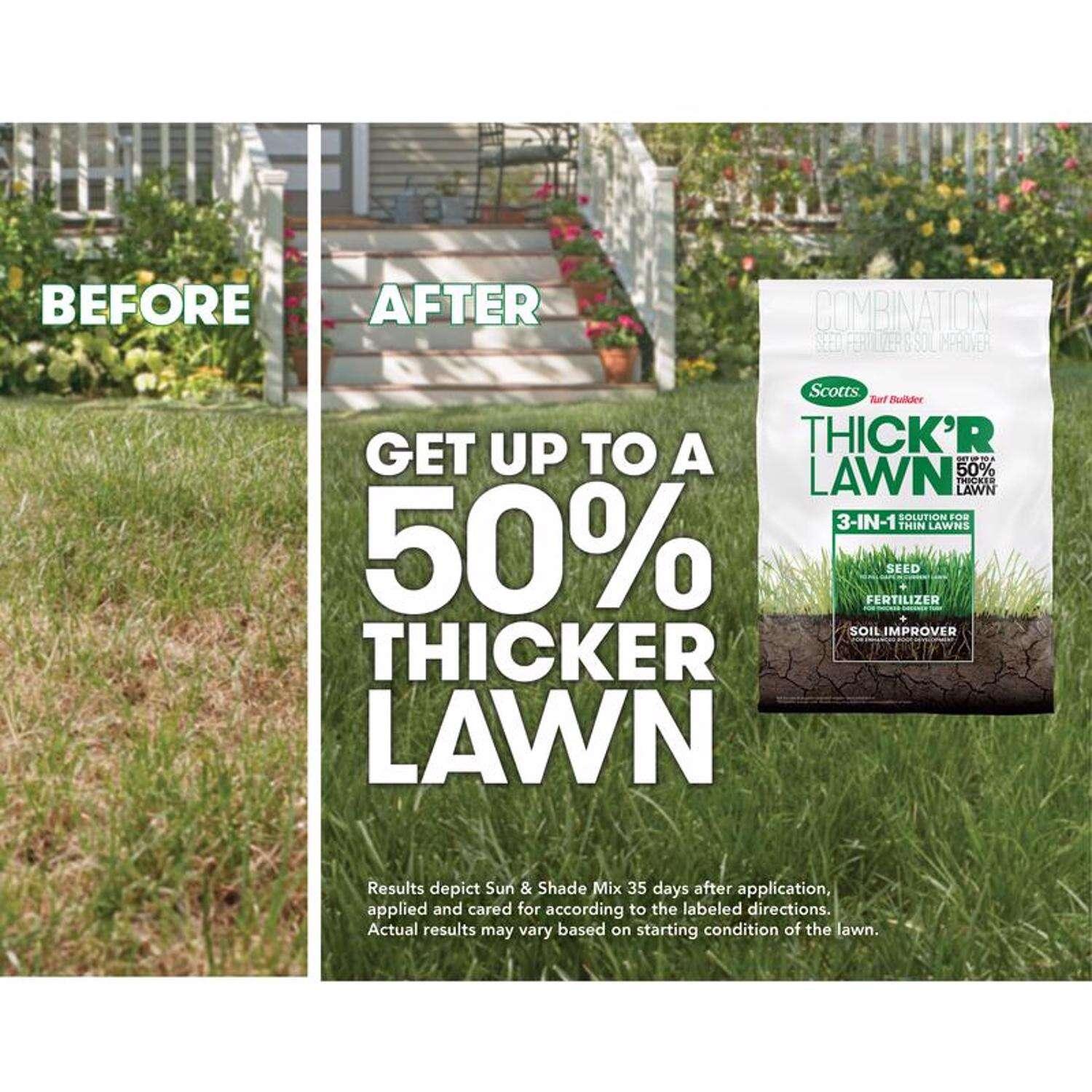 Scotts Turf Builder Thick'R Lawn Sun and Shade has everything you need to help turn weak, thin grass into a thick, green lawn. With this 3-in-1 solution get up to a 50% thicker lawn with just one application subject to proper care, guaranteed. Thick'R Lawn contains soil improver for enhanced root development, seed to fill gaps with new grass and fertilizer to feed new grass and thicken and green existing turf. This product is intended for use on an entire lawn and can be applied easily with a Scotts spreader. Results may vary based on current condition of lawn.