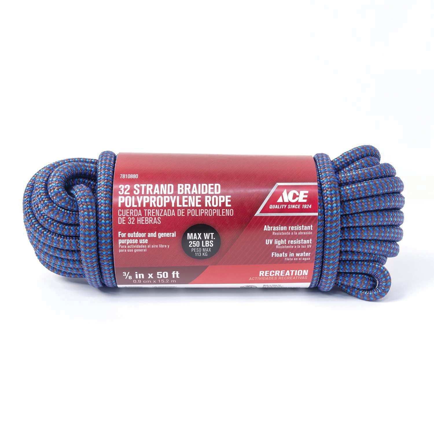 Durable 32‑strand diamond-braided polypropylene rope for outdoor and general-purpose use. UV- and abrasion-resistant, it floats in water and supports up to 250 lb, making it ideal for recreation, marine, and utility tasks.