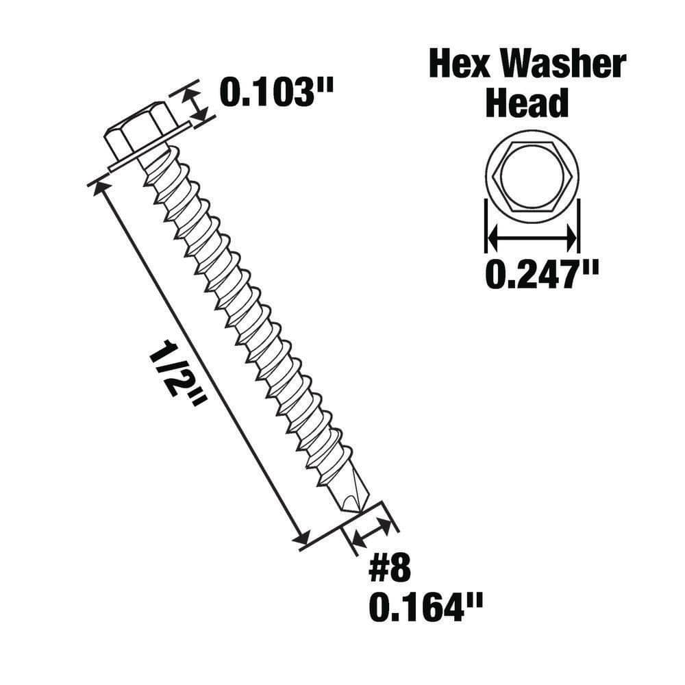These #8 x 1/2 in. galvanized self-drilling screws feature a hex head for fast installation and a durable finish suited for exterior hardware projects. Supplied in a 100-count bag with a charcoal gray color for a coordinated look.