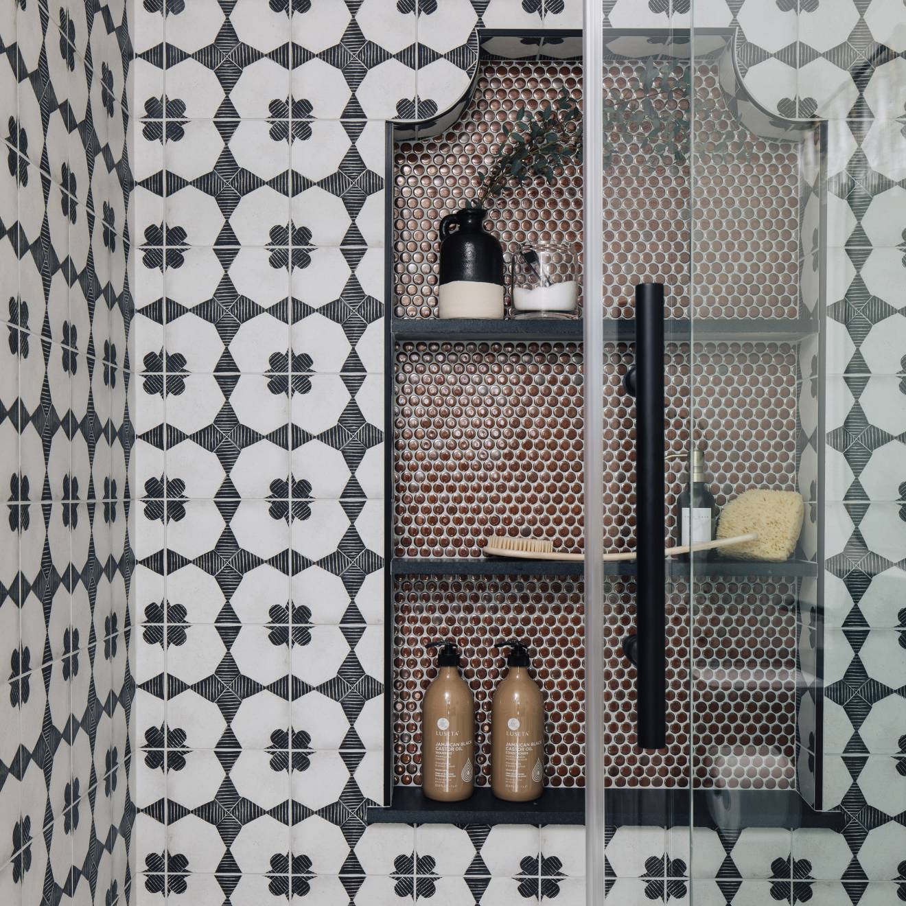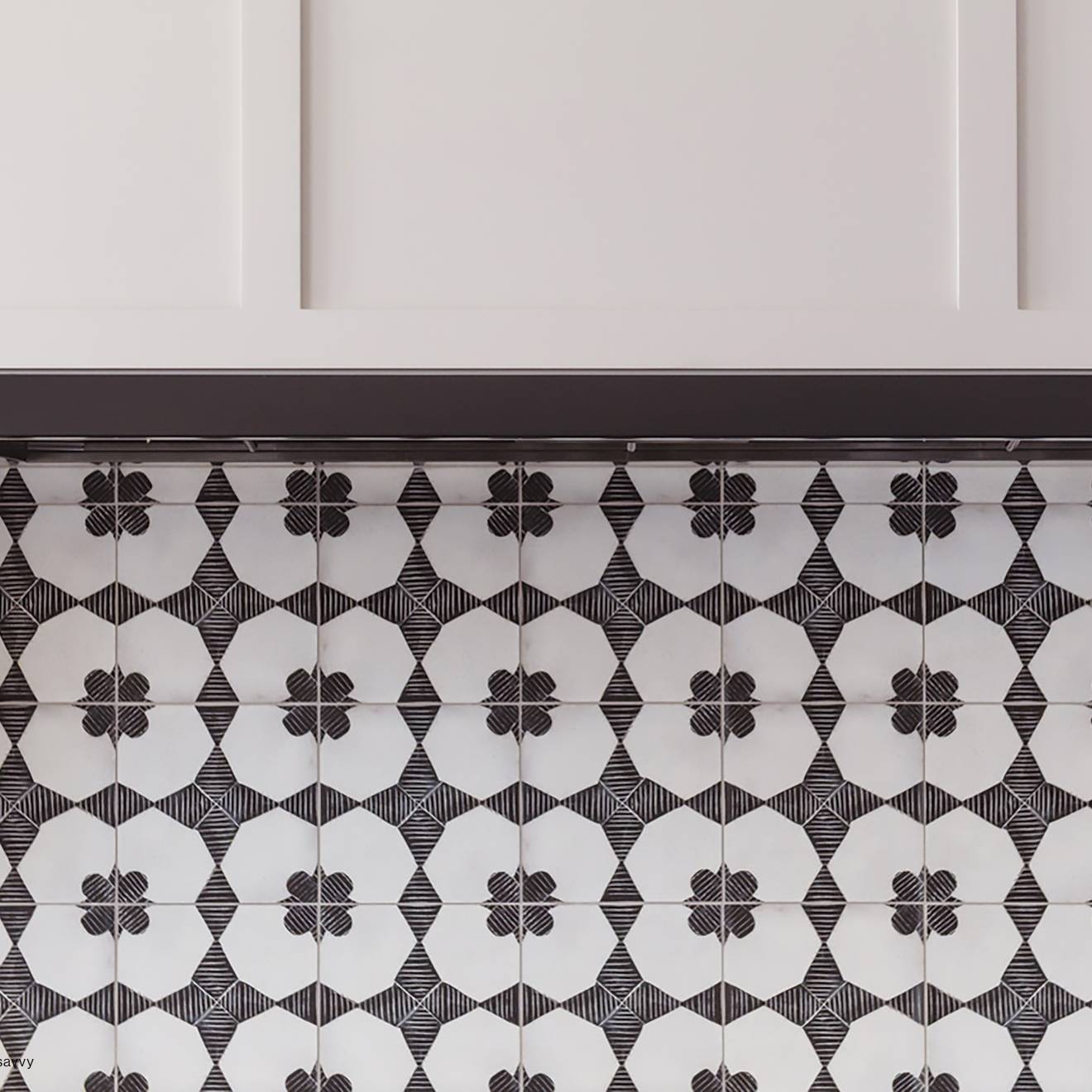 Enchante Moderno dances across the surface with an alluring black-and-ivory motif, echoing the artistry of hand-painted cement. The matte finish tempers the bold geometry, creating a chic, grounded canvas for contemporary cabinetry and warm woods. Try it as a full-floor moment in a powder room or as a backsplash ribbon that wraps the kitchen. It’s a modern essential that elevates everyday spaces with effortless luxury.