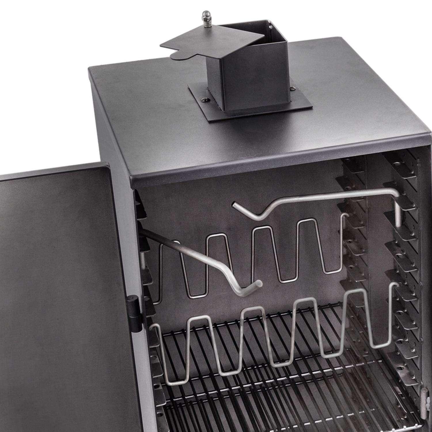 744 square-inch primary cooking chamber includes 3 adjustable porcelain-coated cooking grates, rib racks and two meat hanging hooks