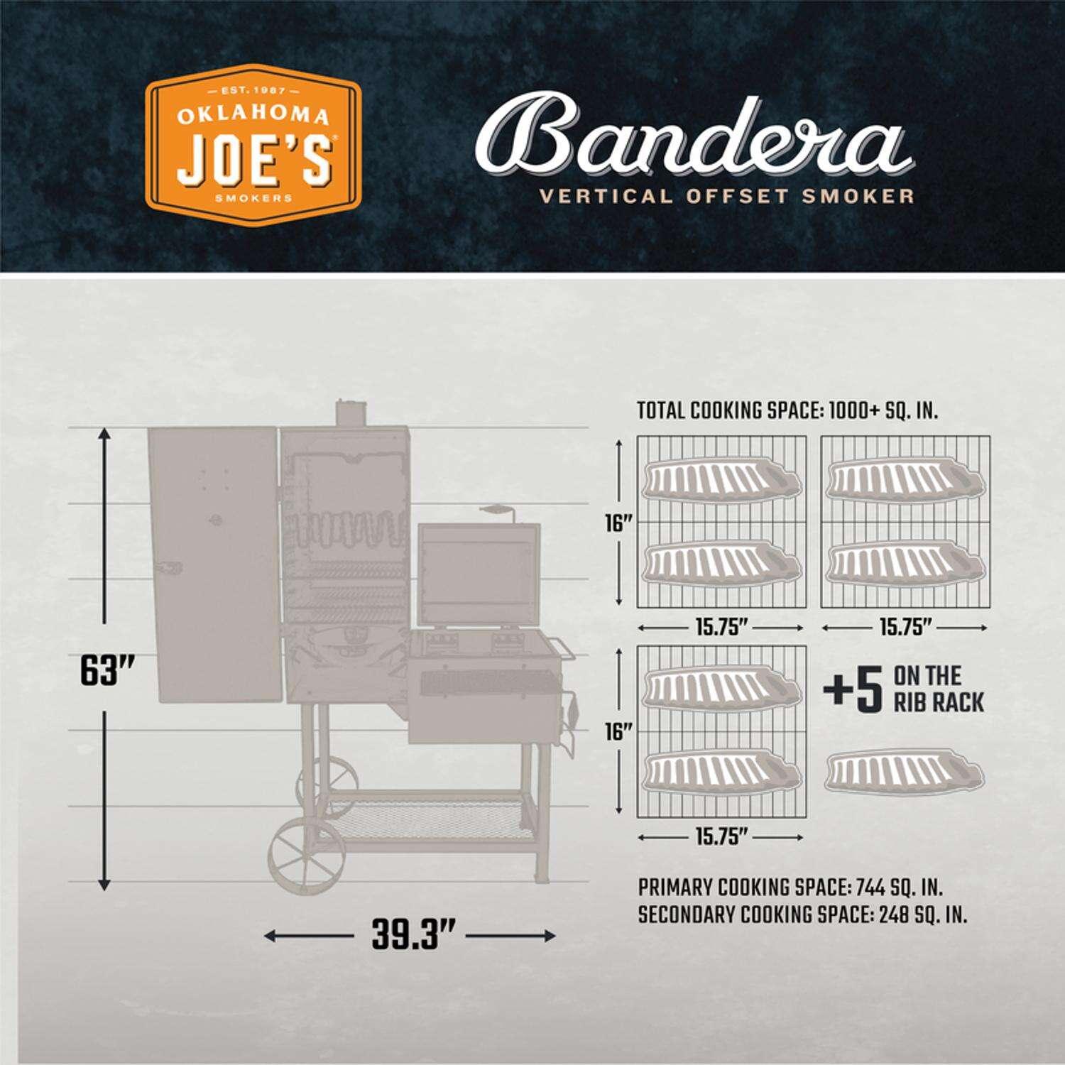 The Oklahoma Joe's Bandera Smoker utilizes the natural rising tendencies of smoke to help you craft delicious results, so your barbecue is exactly how you want it. The heavy-gauge construction, with unique vertical offset design, has ample space to handle the largest of needs and the integrated baffles and dampers make heat and smoke control convenient.