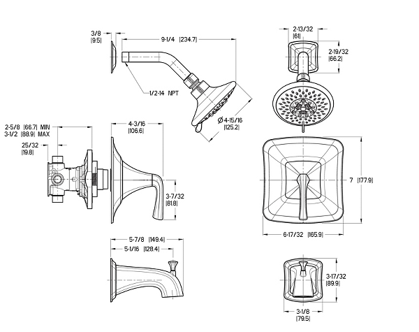 | Dimensions (reference) | See diagram; shower arm 9-1/4 in; trim plate approx. 6-17/32 in square; spout 5-7/8 in length |