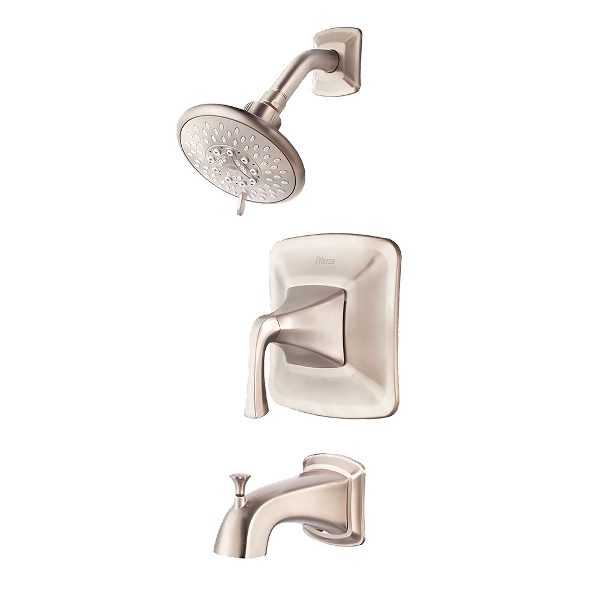 Pfister’s Selia tub and shower set pairs sculptural lines with reliable performance. The multi-function 4-15/16 in. showerhead delivers drench, massage, and rinse sprays, while the included valve with ceramic disc technology helps ensure a long-lasting, leak-free experience.