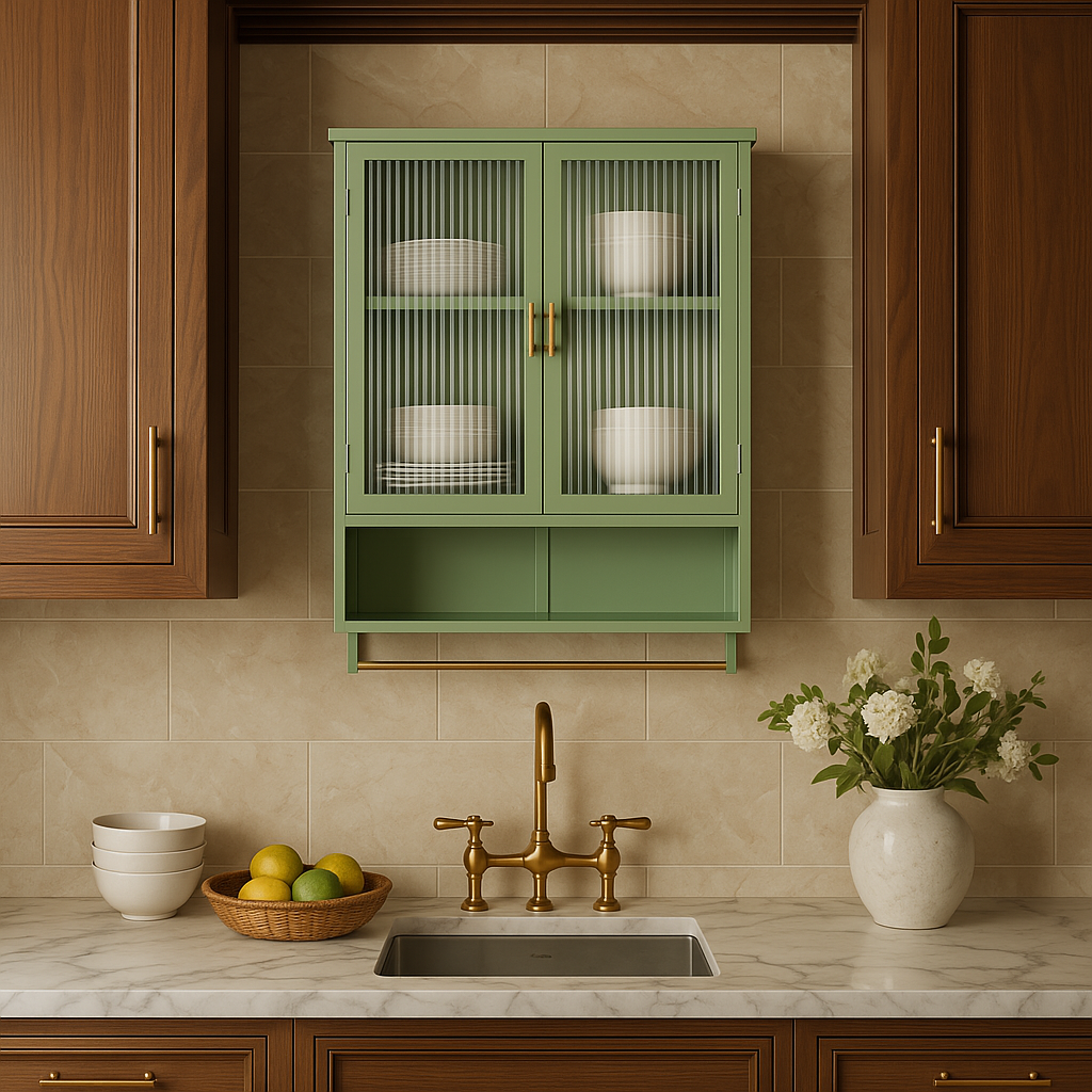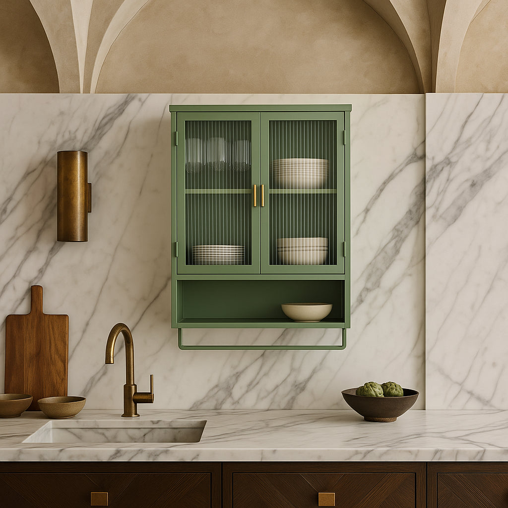 This green iron wall cabinet is a masterpiece of modern design, blending functionality with aesthetic appeal. The fluted tempered glass doors add a touch of sophistication, while the wall-mounted design optimizes space. Style it in a kitchen or bathroom to showcase its versatility and create a focal point that exudes contemporary charm. A must-have for those seeking to combine practicality with luxurious living.