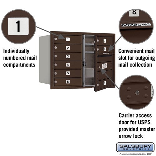 This recessed mounted mailbox unit features 9 doors and a durable bronze finish, designed for secure mail storage and USPS compliance. Ideal for residential or commercial use, it offers heavy-duty construction and convenient front-loading access.
