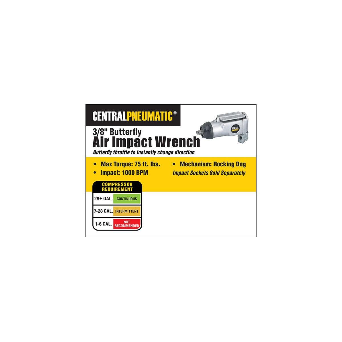 The compact air impact wrench provides up to 75 ft. lbs. of torque and still fits in the palm of your hand. The butterfly throttle lets you instantly change from forward to reverse. The butterfly air impact wrench has a built-in regulator with 8 speed settings.