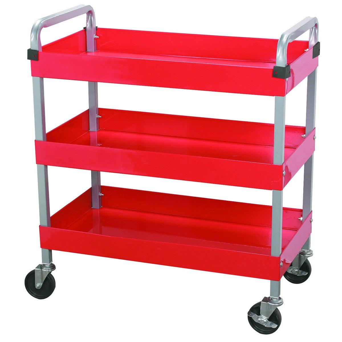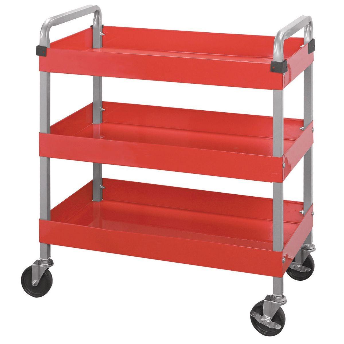 Three trays on this service cart make it easy to organize tools, parts and supplies. Heavy duty sheet steel construction. This three tray cart easily handles loads up to 350 lb.. Solid rubber casters let you maneuver the service cart easily. Deep shelves give you plenty of storage for your tools and parts.