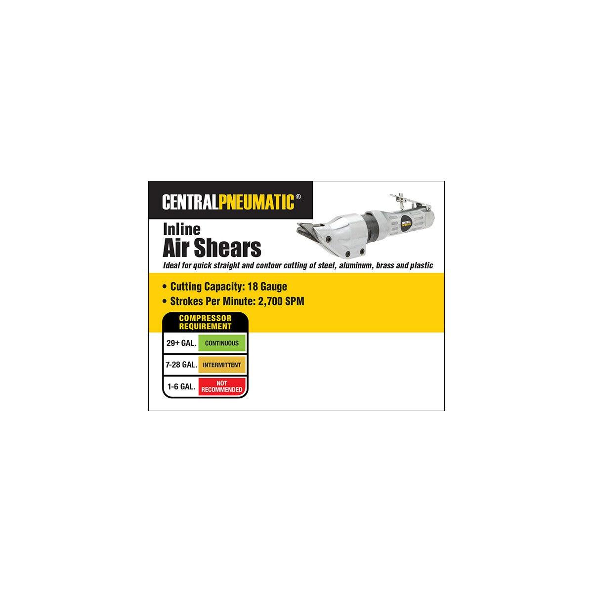The inline grip on these industrial quality air shears gives you superior control for smooth, clean cuts through sheet metal, aluminum and plastic! The cutter head swivels a full 360 degrees, allowing you to make straight and contour cuts with a minimum of edge distortion. The easy-to-use inline air shears feature a lightweight design that allows you to work longer with less fatigue.