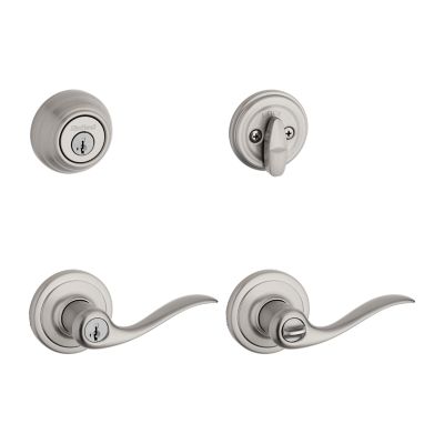 Upgrade exterior door security with the Kwikset Tustin combo pack featuring a single-cylinder deadbolt and keyed entry lever. SmartKey Security lets you re-key in seconds, while the reversible lever and adjustable latch ensure easy, universal installation.
