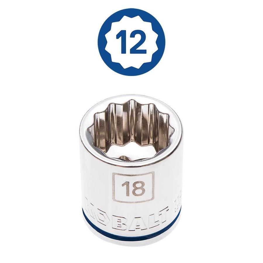 12 point socket sizes include 5/16, 3/8, 7/16, 1/2, 9/16, 5/8, 11/16, 3/4, 13/16, 7/8 and 9, 10, 11, 12, 13, 14, 15, 16, 17, 18 and 19 mm