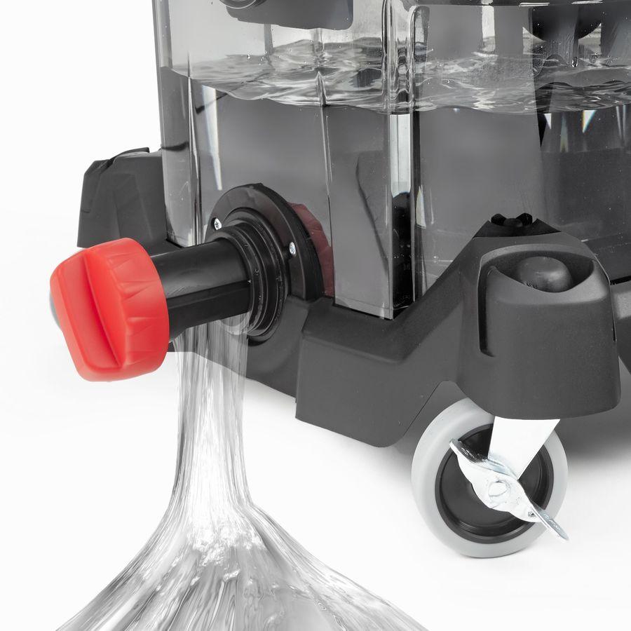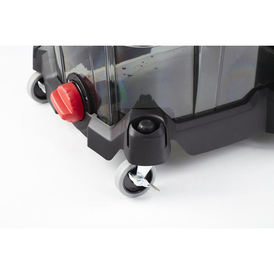 Plastic tank with transport handle and large rear wheels allow for easy mobility, and locking casters keep the unit from rolling around