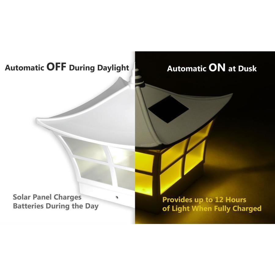 High performance solar lights stays lit for up to 12 hours Lights up automatically every night auto off switch 2 high output LED's for warm yellow candle light 2 long life AA NiCad rechargeable batteries included Will fit over an actual 5-in x 5-in or 4-in x4-in post (4-in x 4-in adaptors-included) Patent number D616,134S