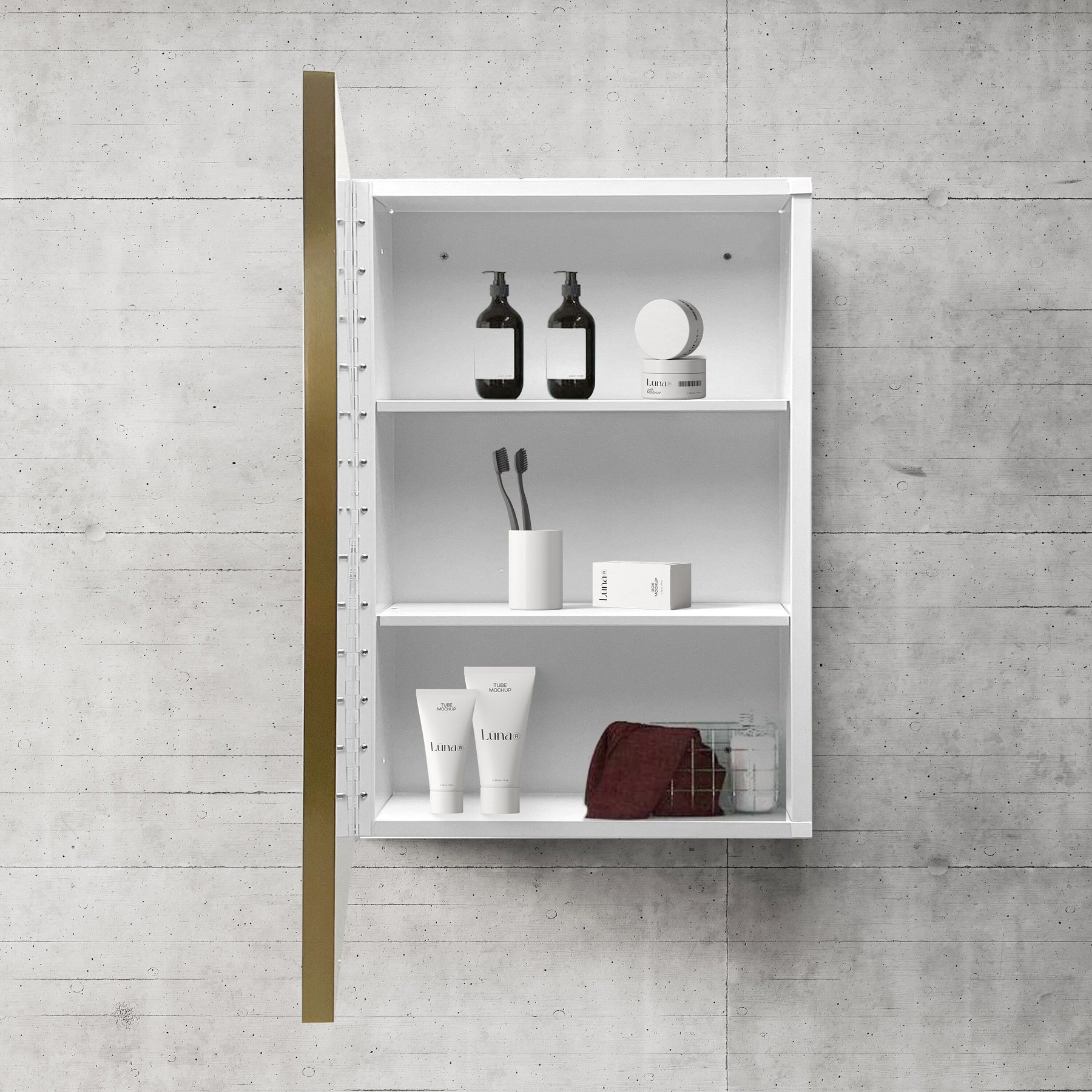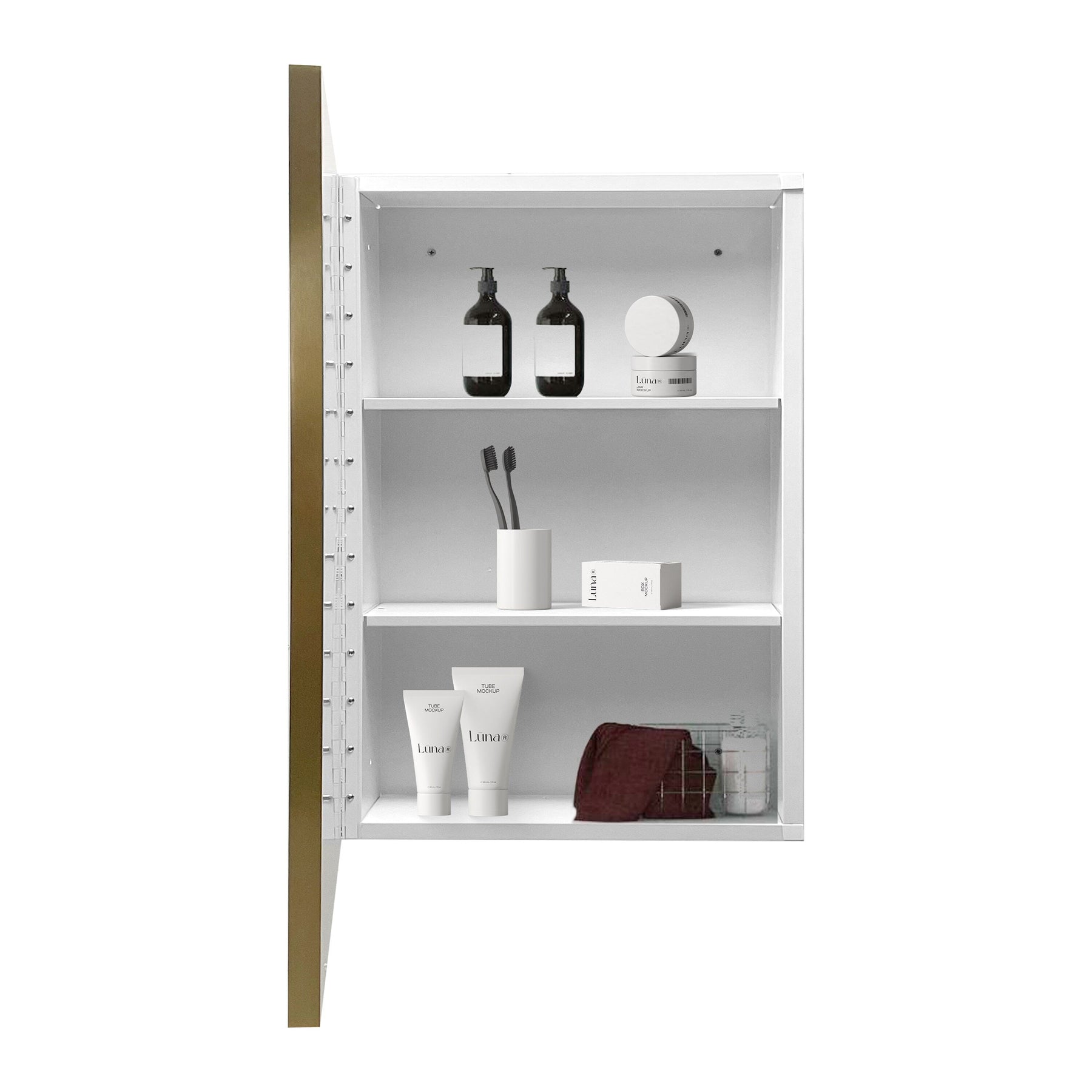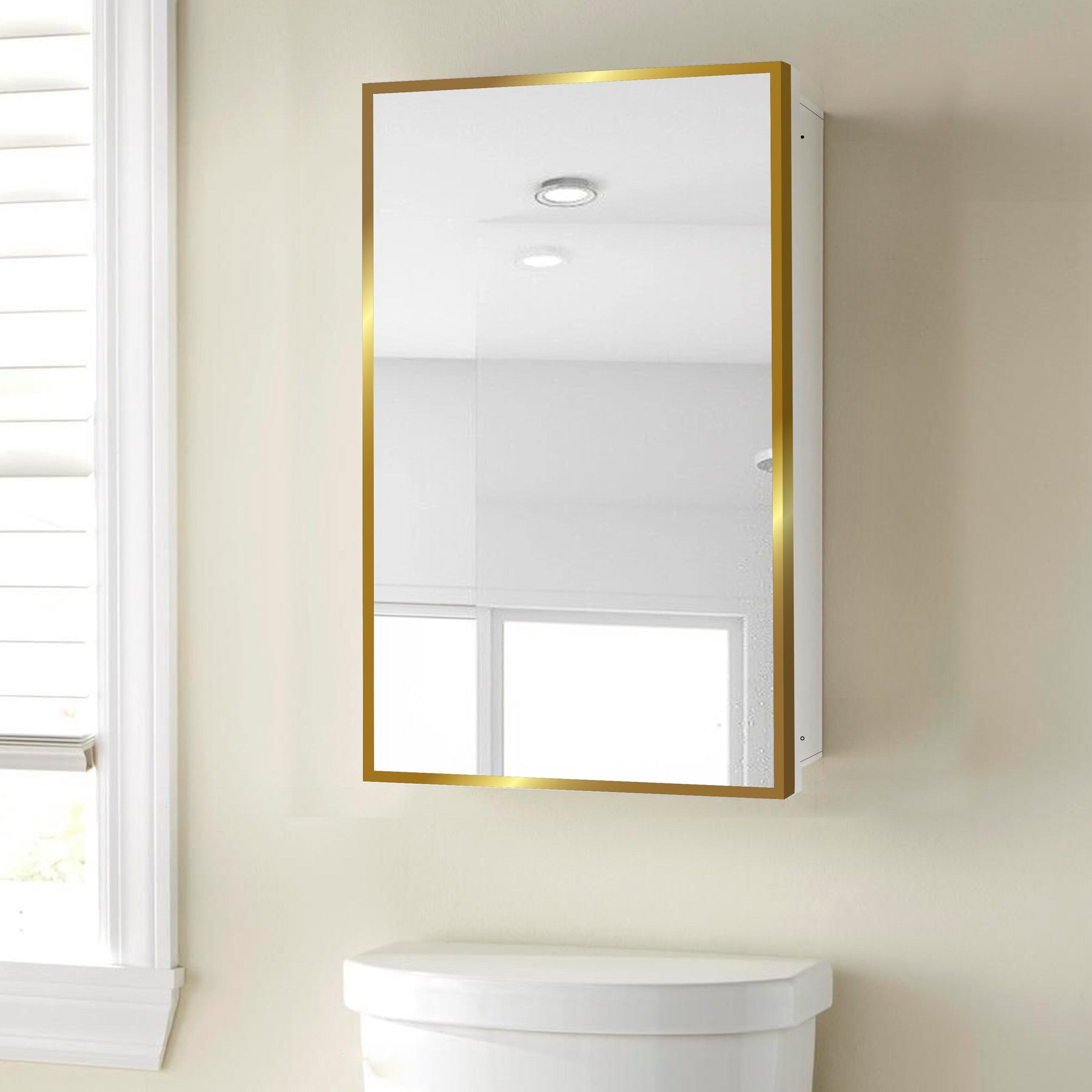 Infuse a sense of calm and sophistication into your bathroom with this exquisite mirrored medicine cabinet. Its polished white finish and subtle gold rim blend seamlessly for an opulent touch that doesn’t overpower. Mount it recessed for a minimalist appearance that enlarges your space, or surface-mount for a more pronounced statement. This cabinet not only declutters but stands as a testament to refined, luxurious living.