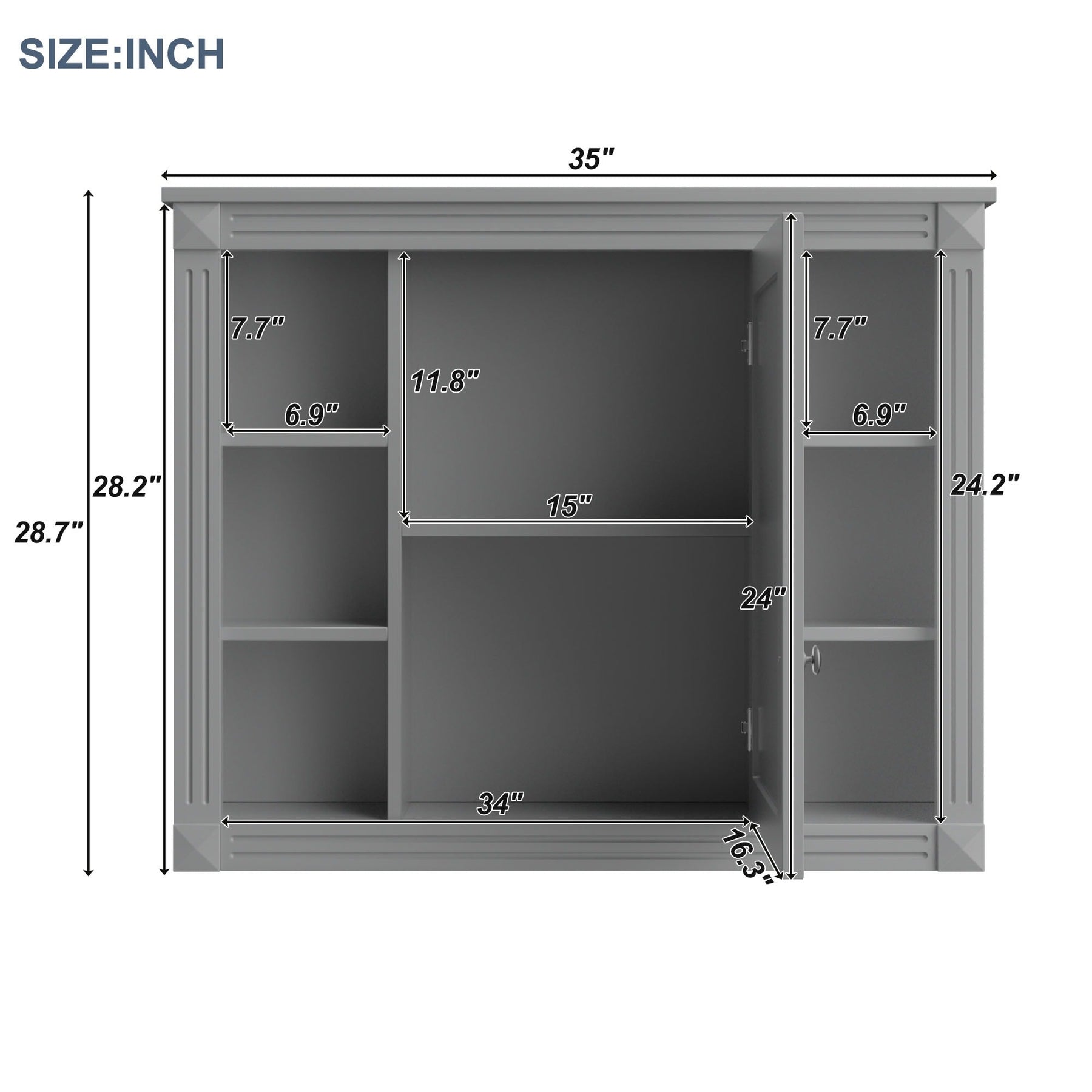 The AAZJ CMR 35-in x 28-in Surface Mount Gray Mirrored Soft Close Medicine Cabinet offers an elegant solution for your bathroom needs. Combining sophisticated design with practical storage, this cabinet seamlessly fits into any style bathroom while providing ample space for your essentials.