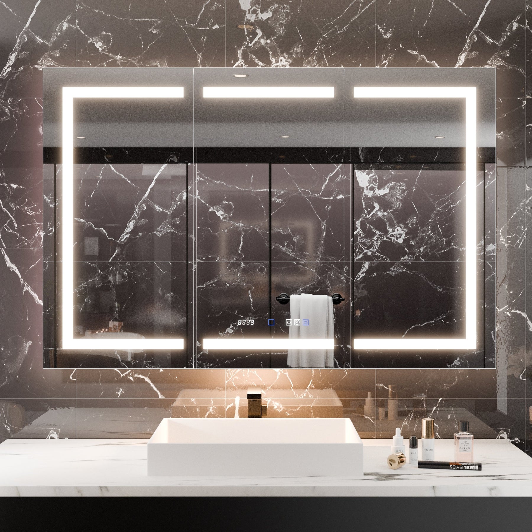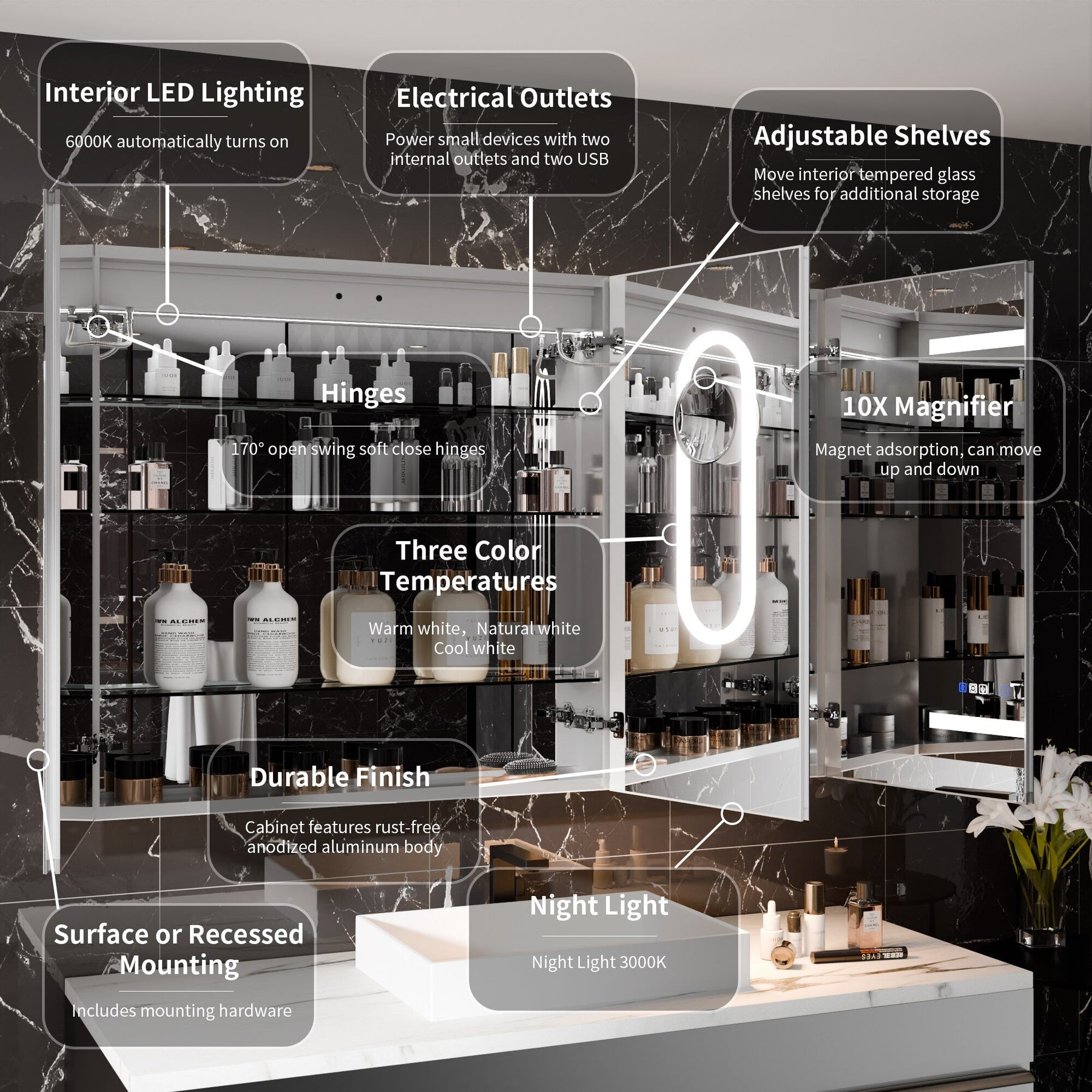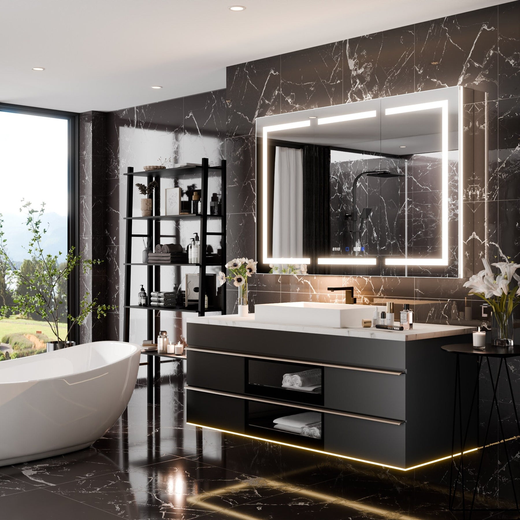 Elevate your bathroom with the AAZJ EX11 LED Medicine Cabinet, featuring a sleek frameless design and advanced functionalities like fog-free mirrors, infinite dimming, and a 10x magnifying mirror. Whether surface or recessed mounted, its sophisticated lighting options create the ideal ambiance for your space.