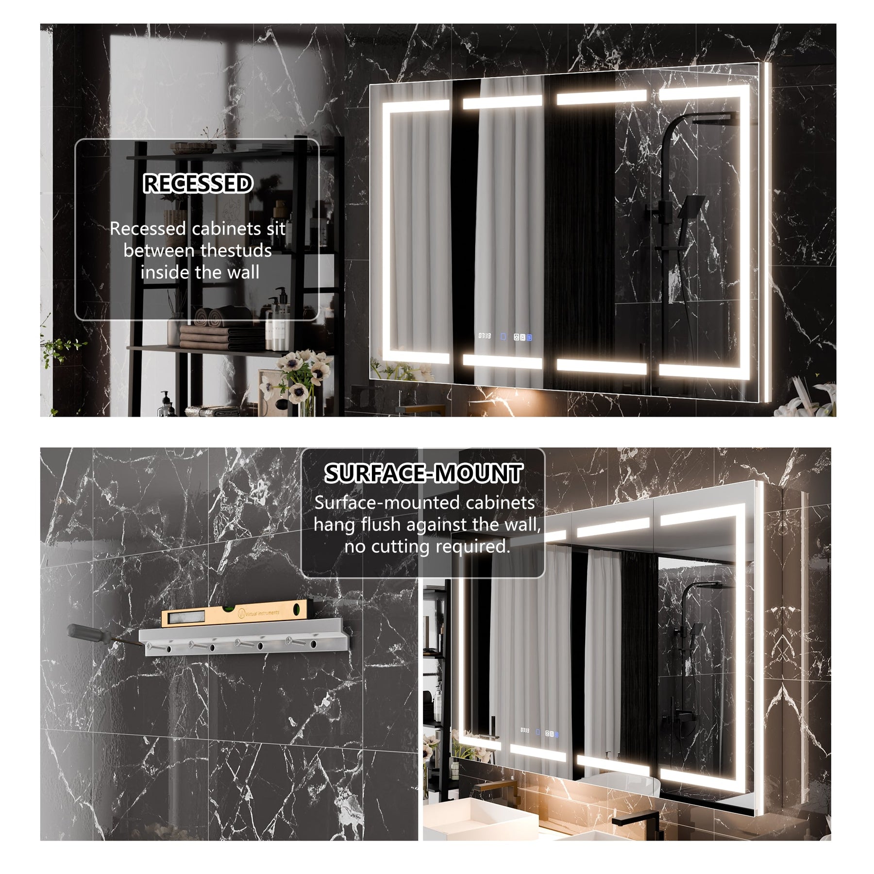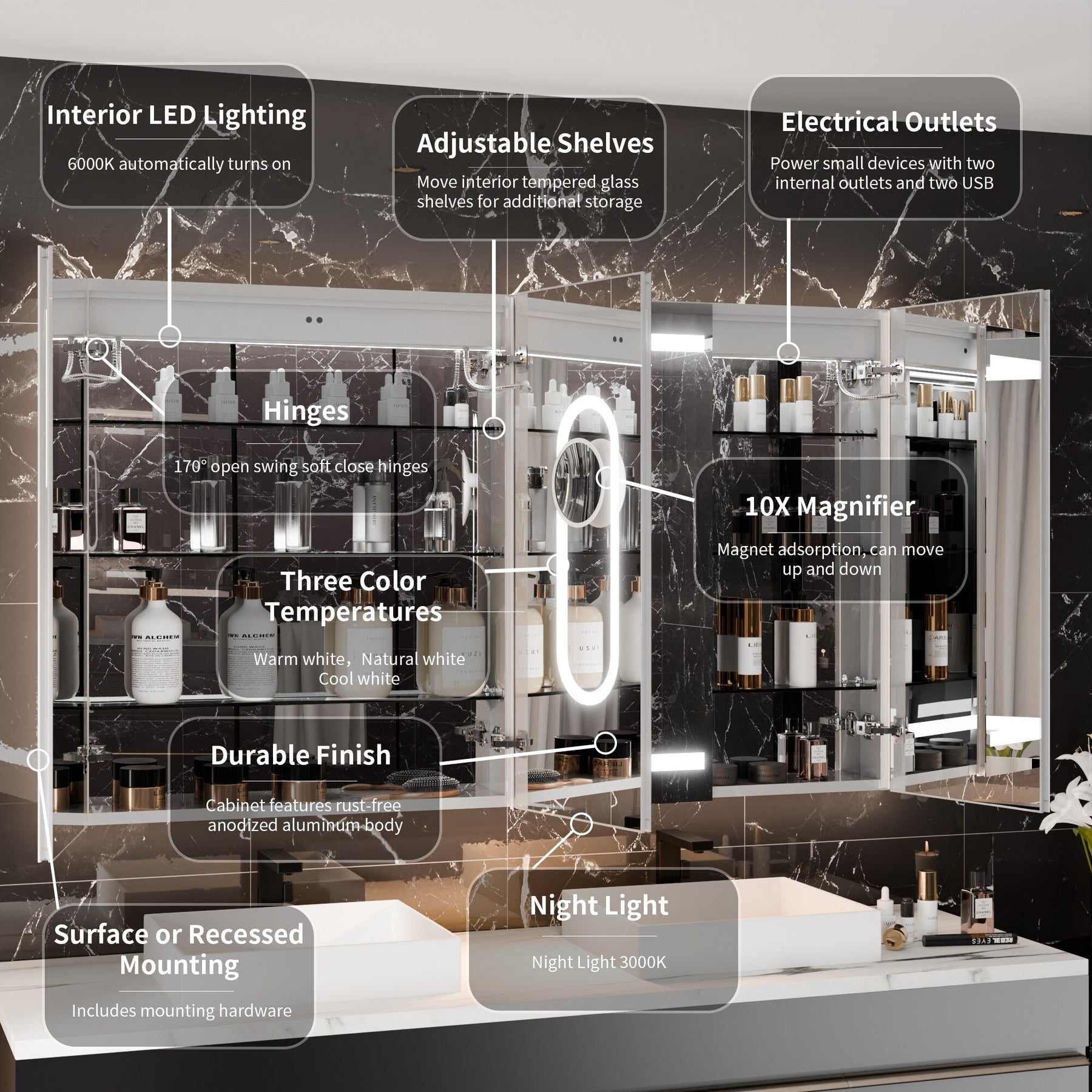 Versatile Mounting: Offers both surface and recessed installation with adjustable glass shelves for optimal organization.