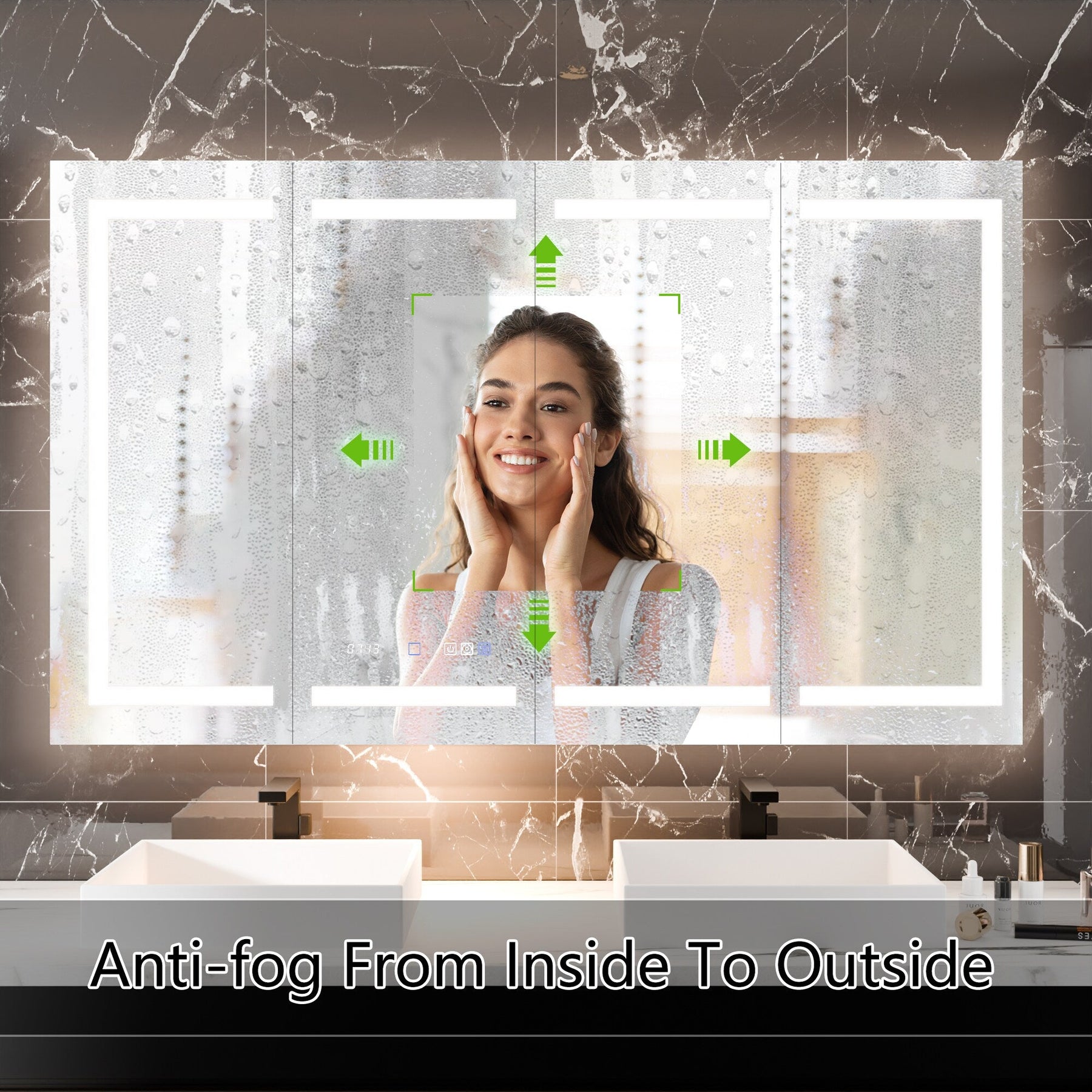 Q: How does the defogging function work? A: The cabinet features a built-in defogging function that activates automatically and powers down after 60 minutes to conserve energy.