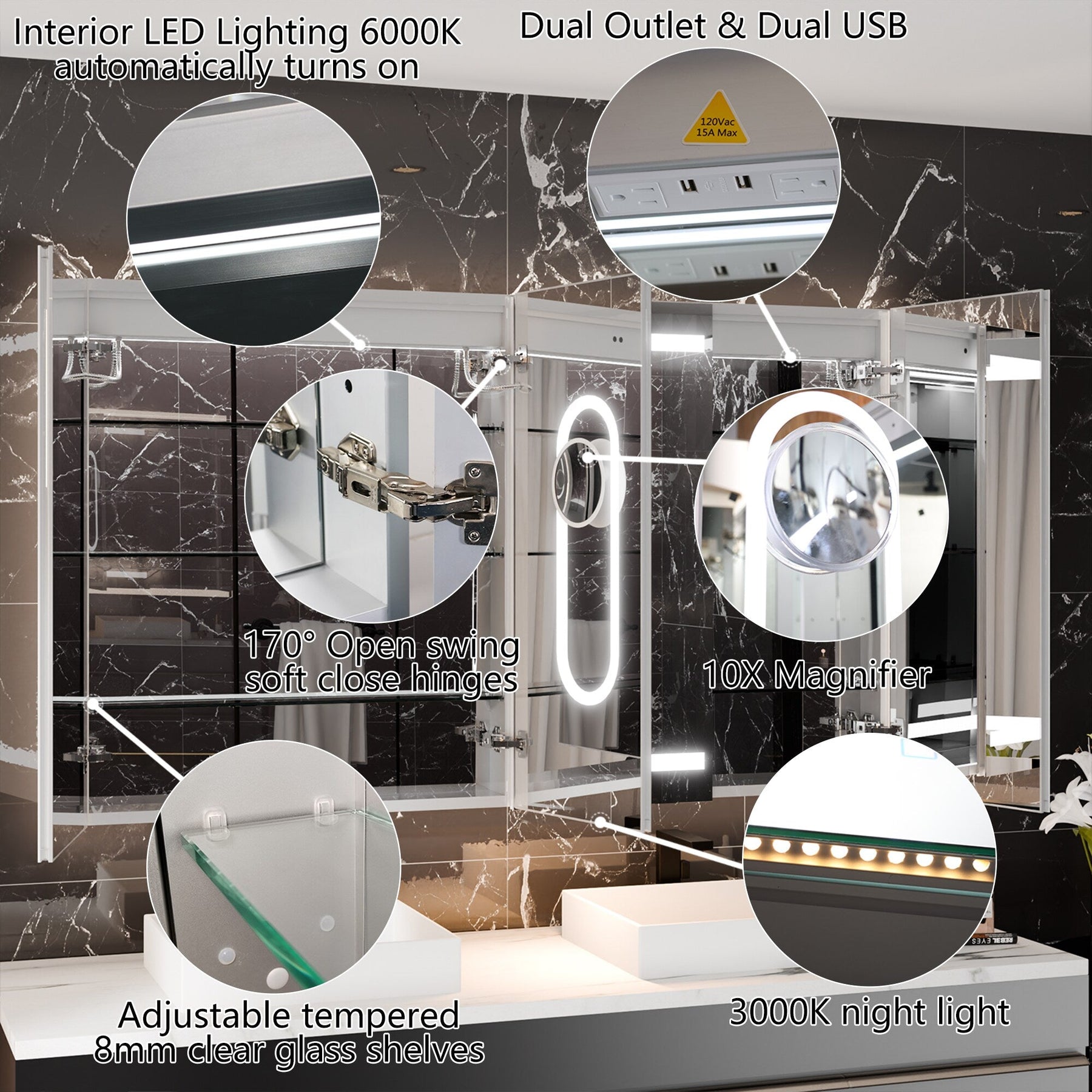 The AAZJ Modern LED Medicine Cabinet combines functionality with elegance, offering fog-free viewing, customizable lighting, and seamless installation options. Its high-tech features, including motion sensing and built-in USB ports, make it a perfect upgrade for any bathroom.
