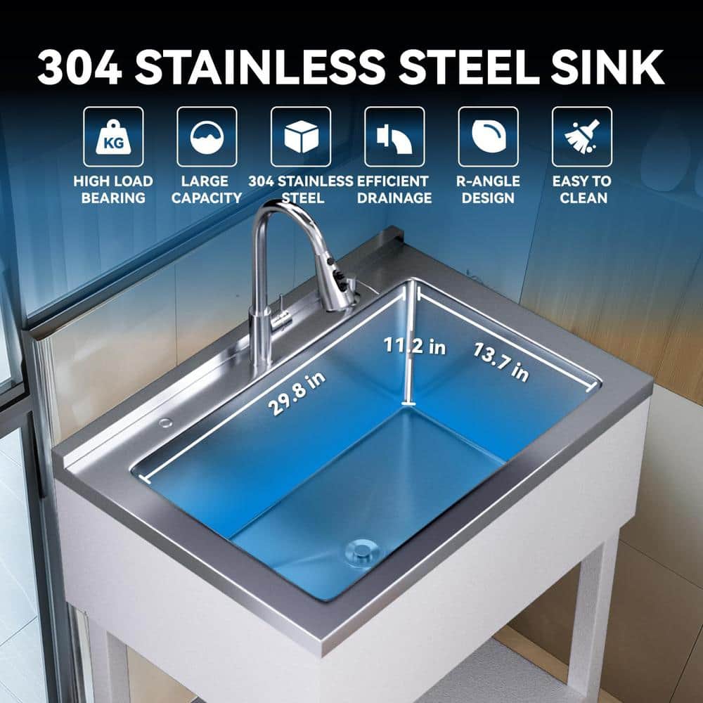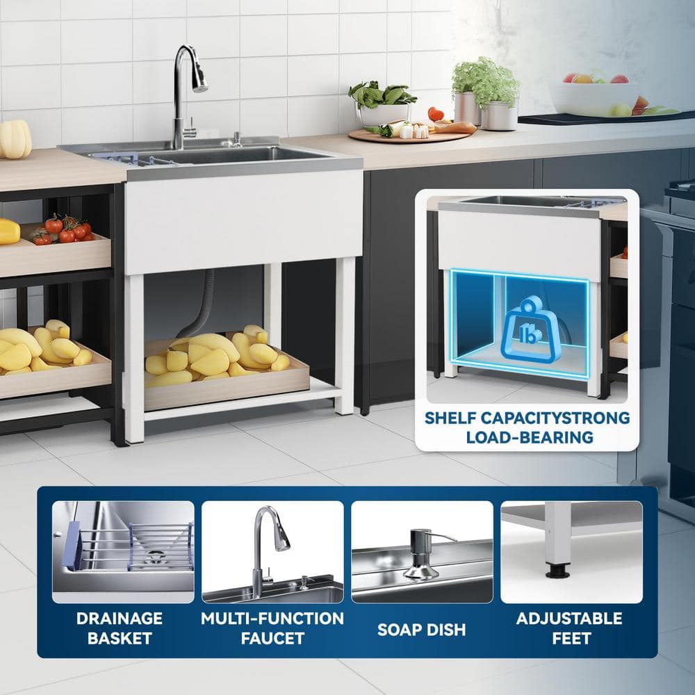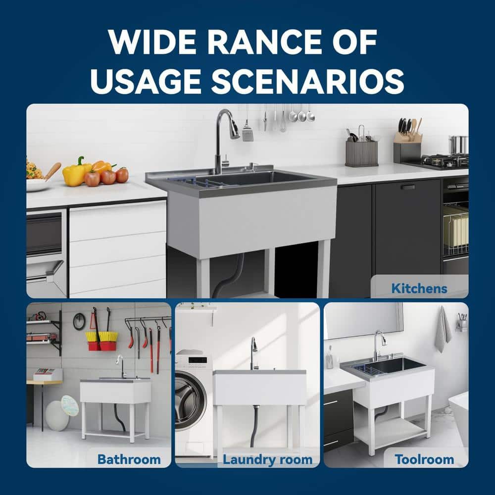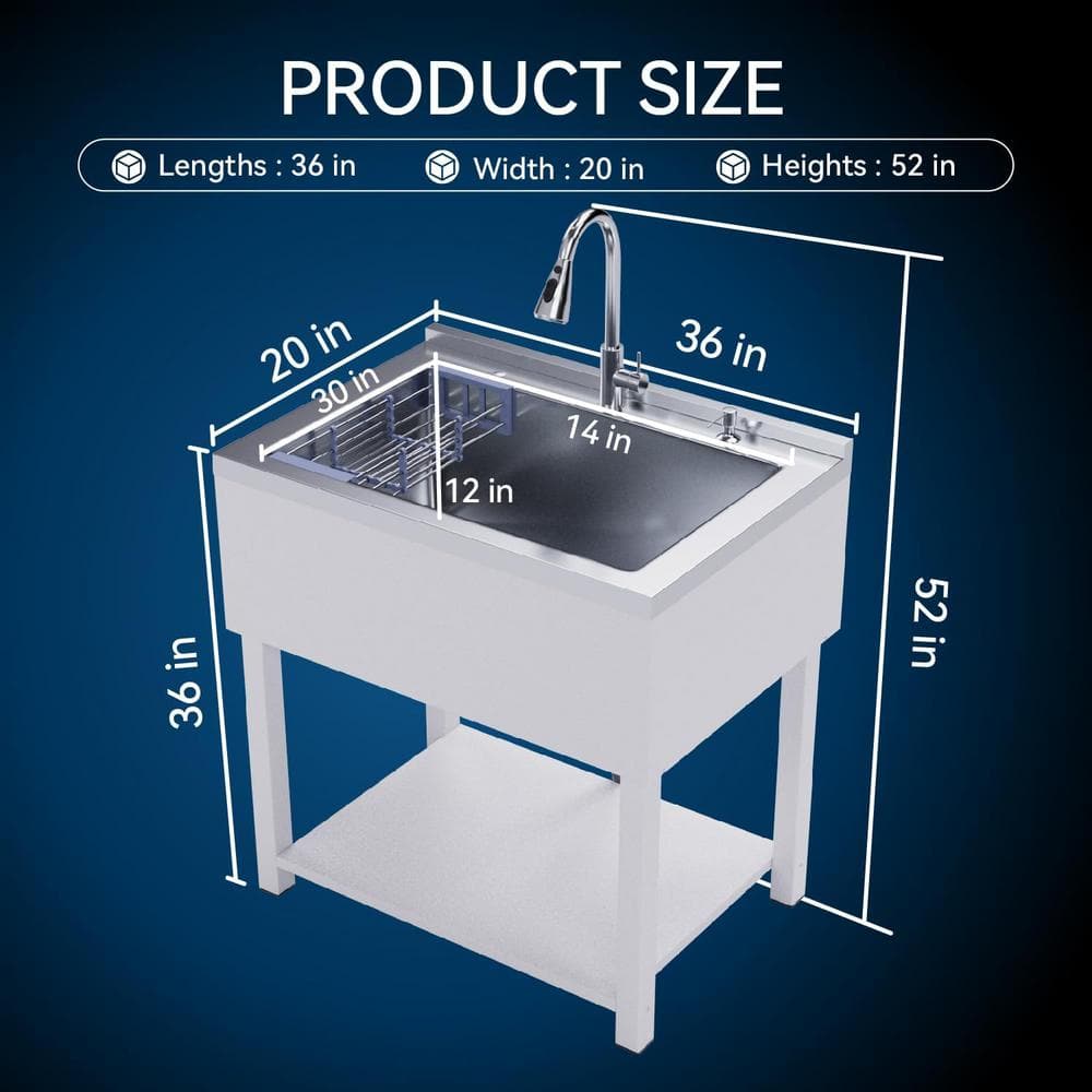 Enhance your workspace with the Adrinfly 36 in. Freestanding Stainless Steel Utility Sink, designed for versatility and durability with its premium 304 stainless steel construction and sleek white powder-coated finish. This multifunctional sink is equipped with a 360° swivel pull-out faucet and adjustable feet, making it perfect for diverse environments like kitchens, laundry rooms, and workshops.