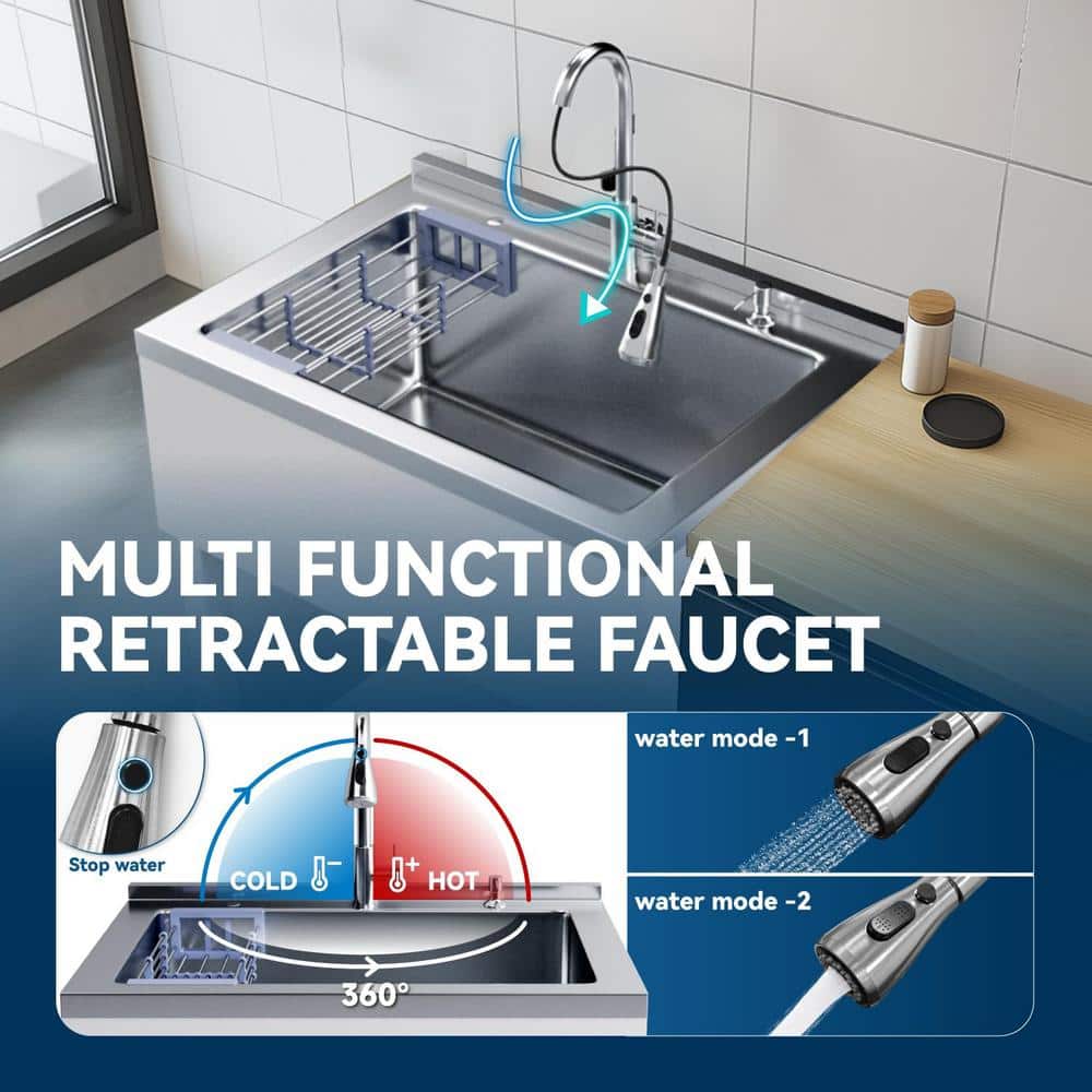 - 360° Swivel Faucet: Features a pull-out gooseneck faucet for complete bowl coverage and dual water modes.