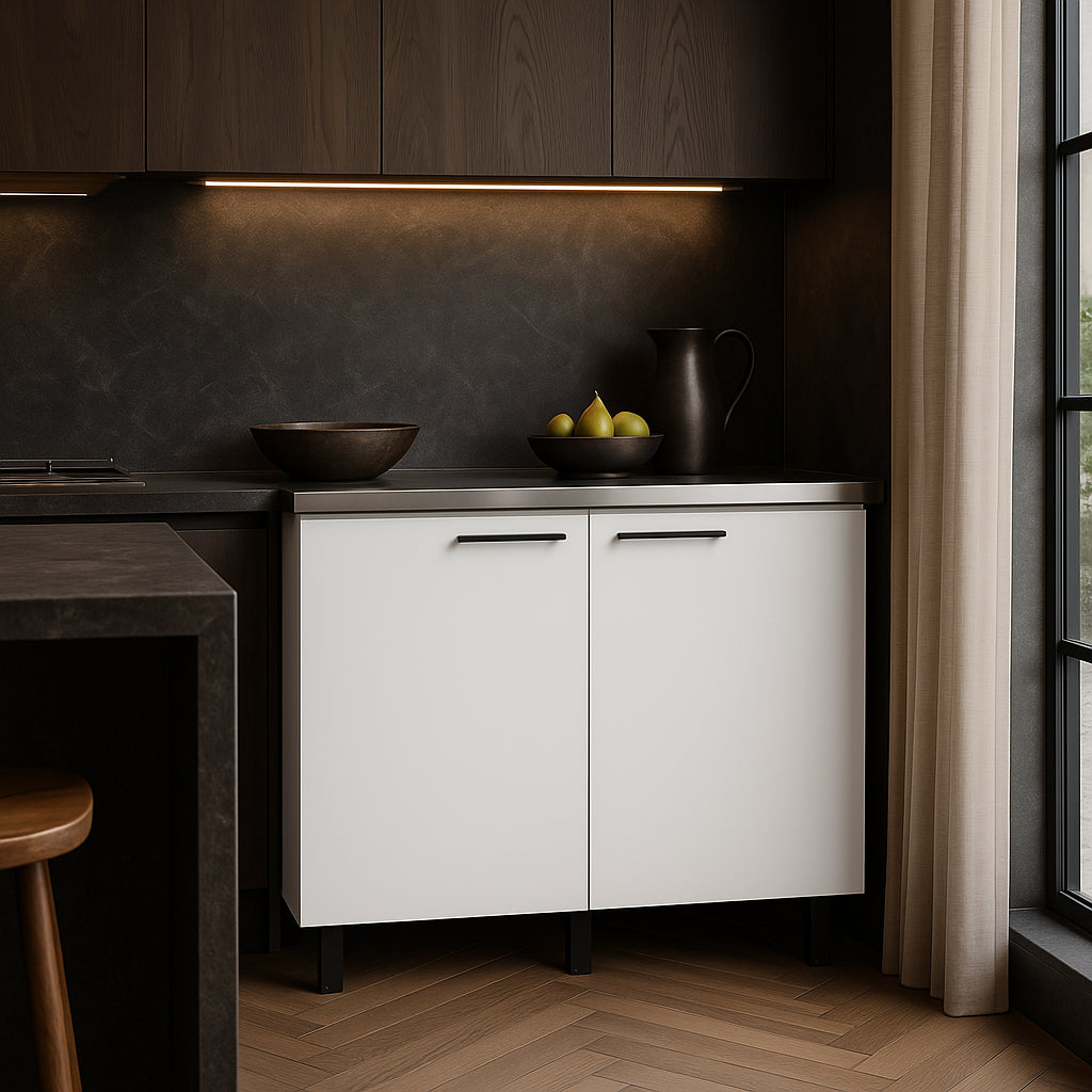 This freestanding utility base cabinet is a masterpiece of modern design, blending functionality with aesthetic appeal. The stainless steel countertop adds a professional touch, while the sleek white finish complements any kitchen decor. Style it with minimalist accessories to highlight its clean lines, or pair it with bold accents for a striking contrast. Essential for creating a sophisticated and organized kitchen space.