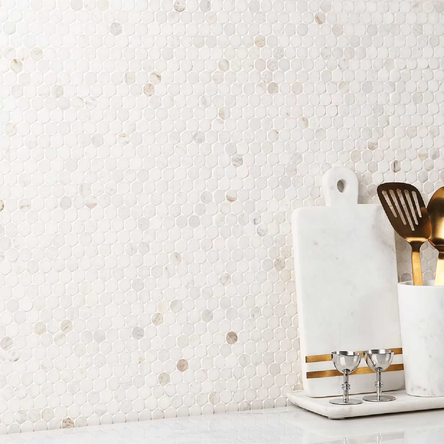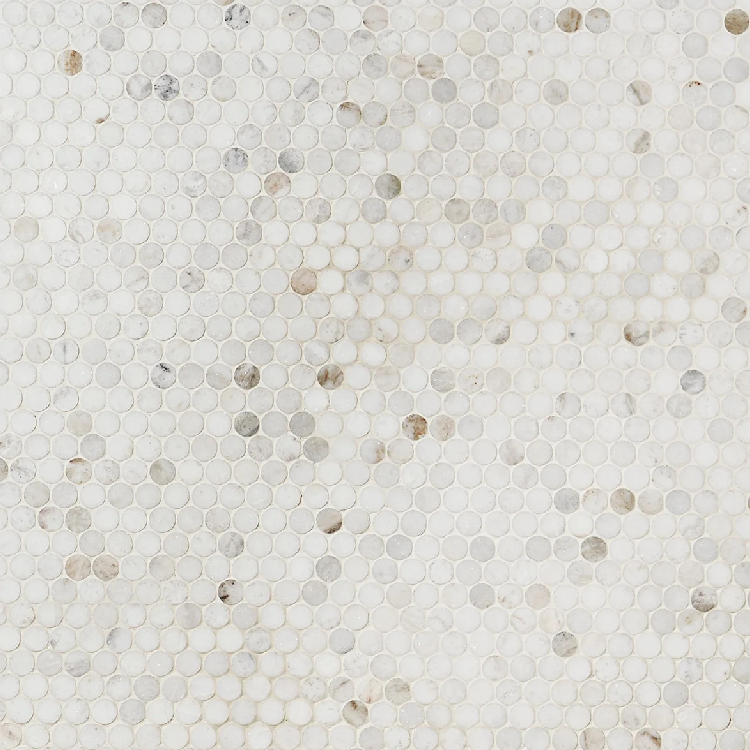 Transform your space with the elegance and sophistication of Alaska White 3/4" Penny Round Polished Mosaic Tile. Order now to add a timeless touch to your interiors and exteriors. Hurry, stock is limited!