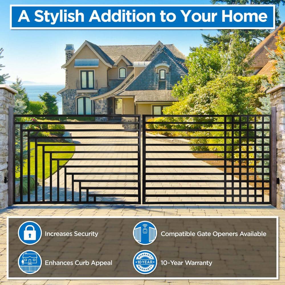 Enhance your home's security and curb appeal with the ALEKO Kyiv black metal dual swinging driveway gate. This premium gate is crafted from fully welded hot-dipped galvanized steel for superior strength and durability, featuring a rust-resistant powder-coated finish that maintains its sleek look for years. Designed to transform any driveway, it combines modern elegance with robust functionality.