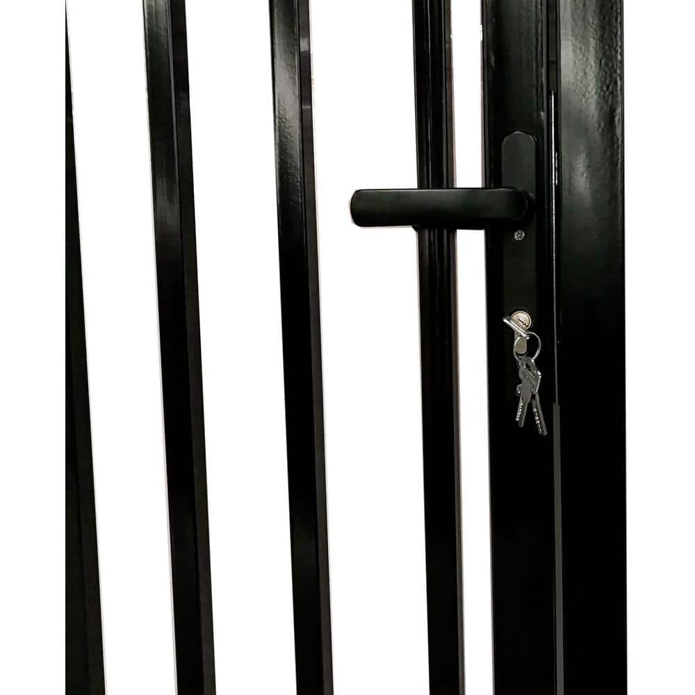 The ALEKO Vienna Dual Swinging Driveway Fence Gate combines European elegance with durable engineering. Constructed from galvanized steel, this gate features a sleek black finish with a convenient pedestrian door for easy access. It's designed to elevate both the security and aesthetic appeal of any property.
