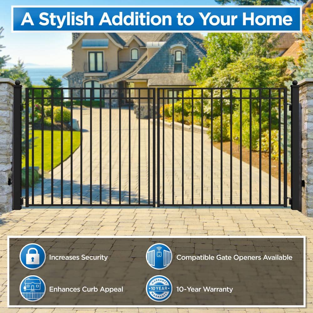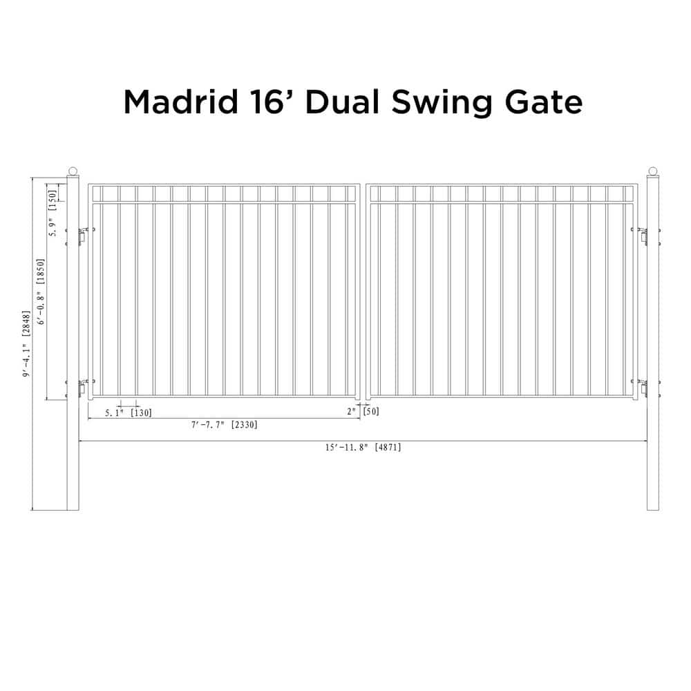 Enhance security and curb appeal with the ALEKO Madrid 16 ft. x 6 ft. Black Steel Dual Driveway Fence Gate. Expertly crafted with galvanized steel and powder-coated for durability, this gate offers a timeless wrought iron aesthetic without the high price. Its Duplex System ensures long-lasting protection against rust and corrosion.