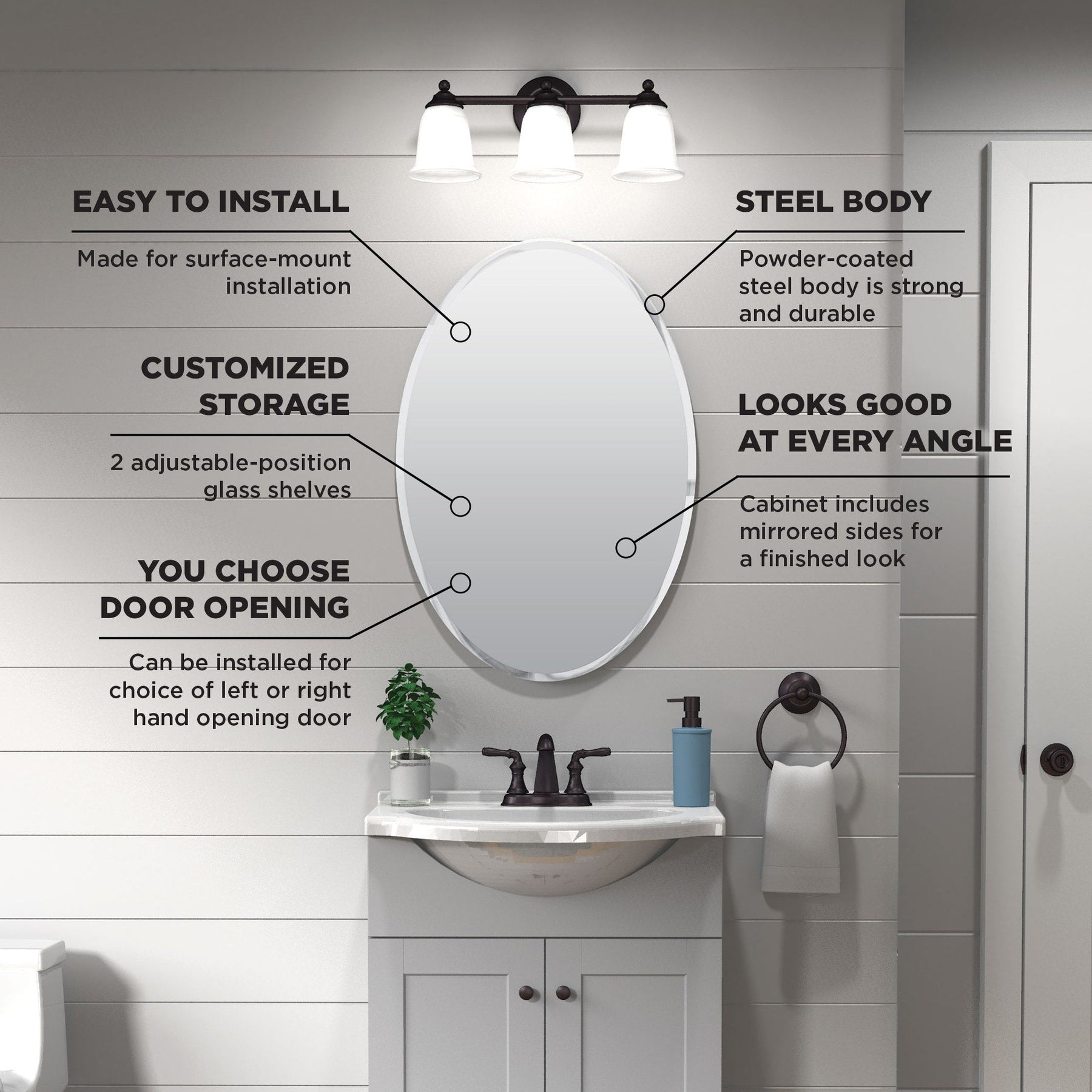 The allen + roth Surface Mount Frameless Oval Medicine Cabinet combines modern sophistication with practical functionality, making it an ideal centerpiece for any bathroom. Its full-overlay mirrored door with beveled edges offers a contemporary aesthetic while providing essential storage with its adjustable glass shelves.