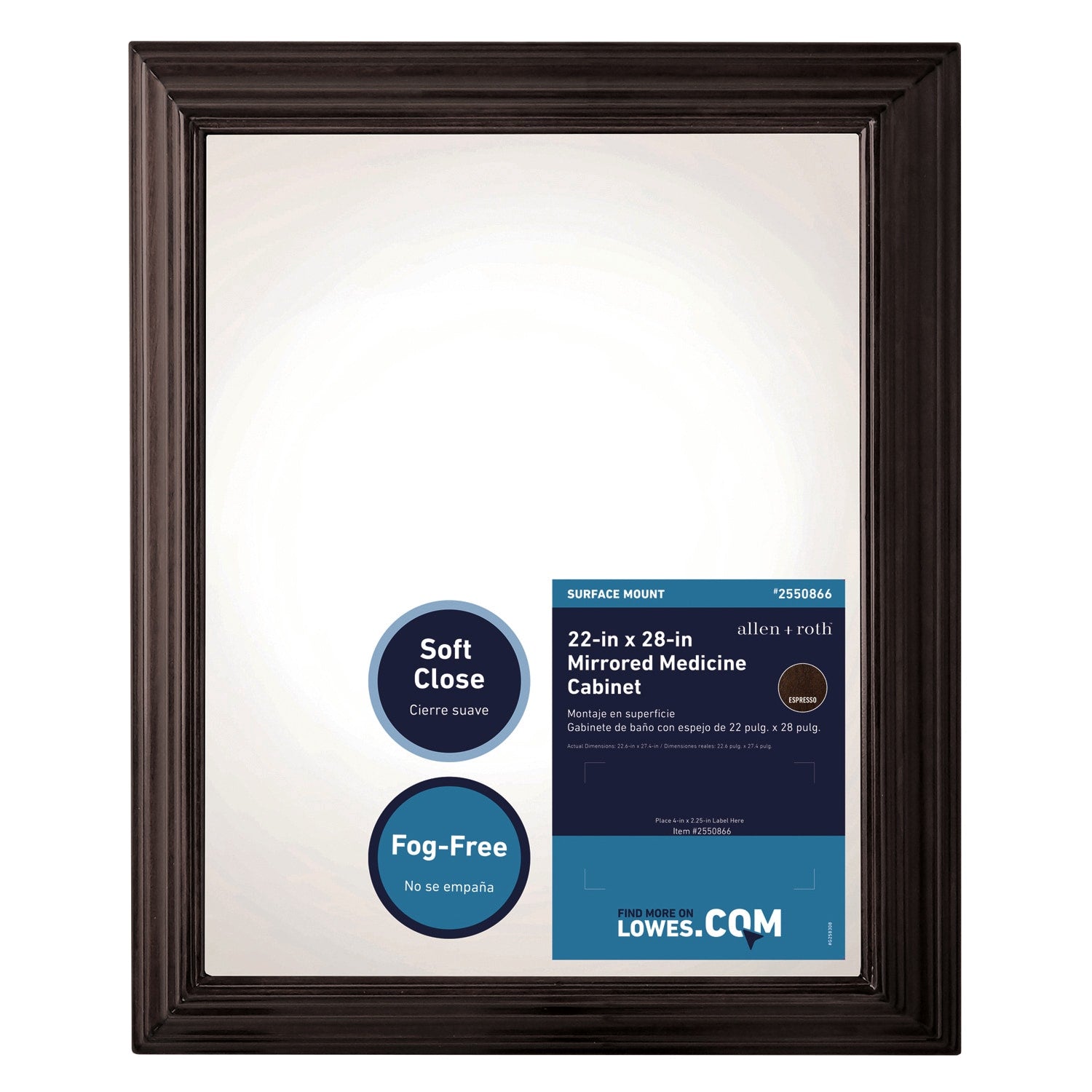 allen + roth 22.5-in x 27.5-in Fog Free Surface Mount Espresso Mirrored Soft Close Medicine Cabinet