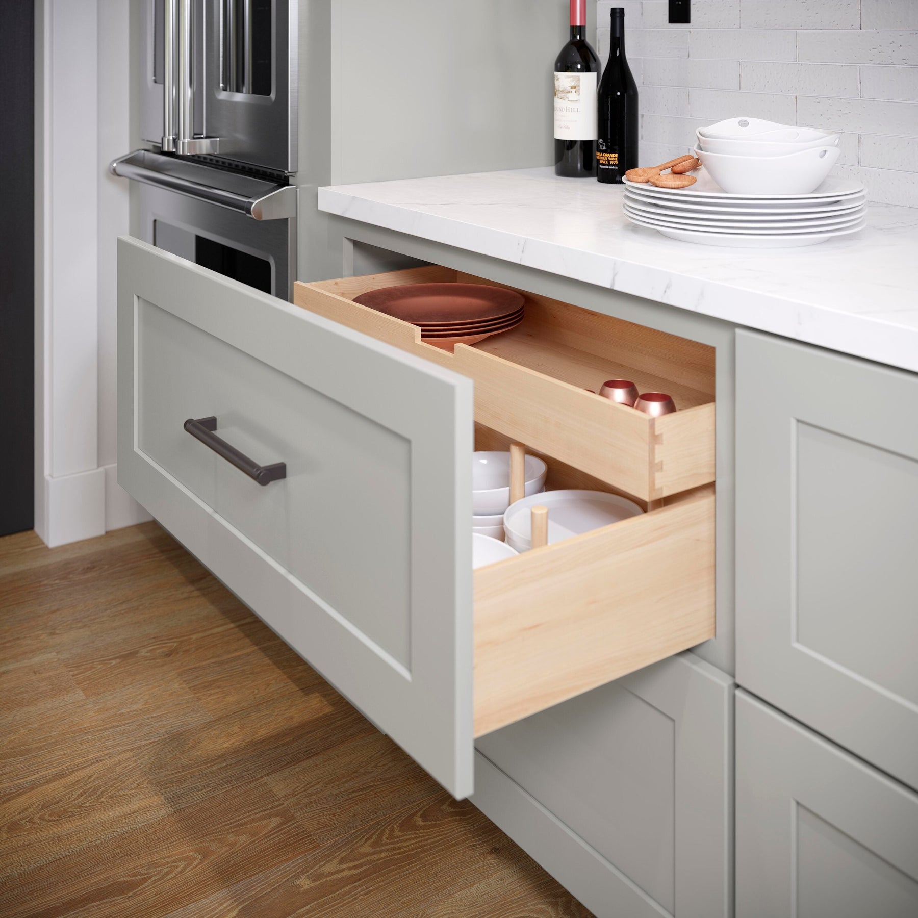 Q: What is the door style and overlay? A: The cabinet features a Shaker-style door with a full overlay, providing a sleek and seamless look.